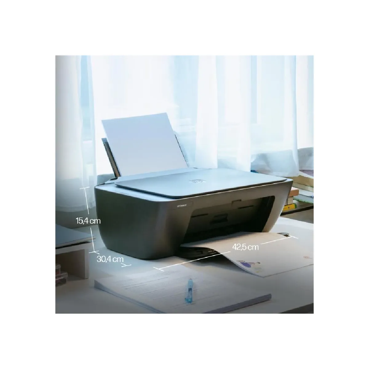 - Consommables : cartouches HP 308 ; compatibilité HP Instant Ink ; cartouches de démarrage incluses (~100 pages noir)