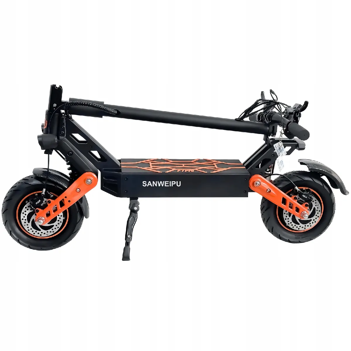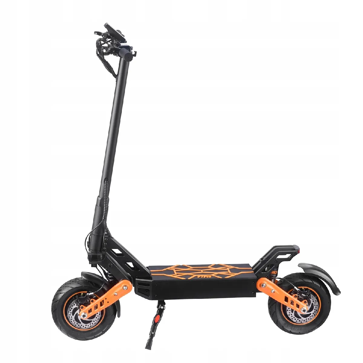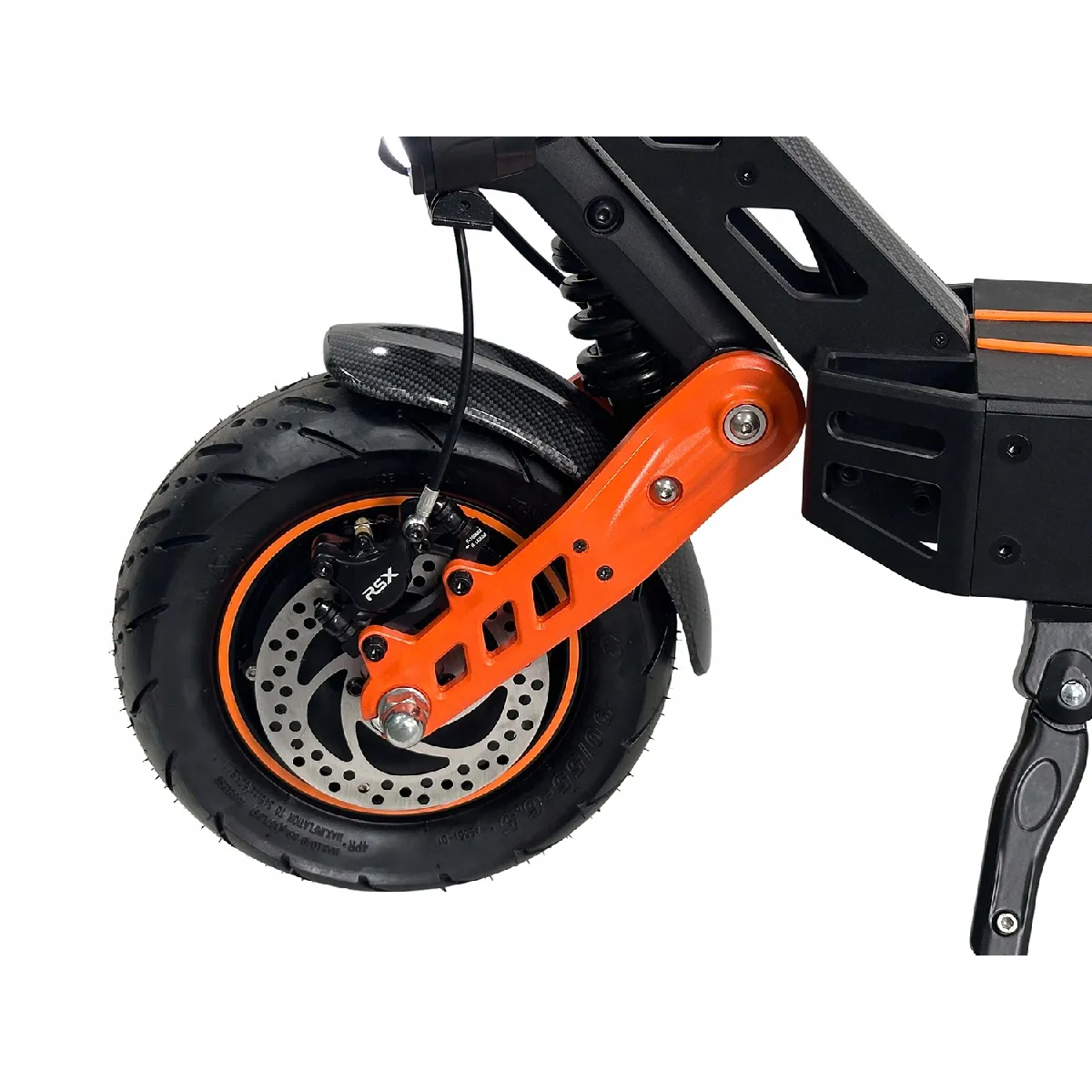 Elle est équipée de freins hydrauliques à disques avant et arrière assurant un freinage rapide et sûr. Les opony tubeless de 90/55-6,5 offrent une bonne adhérence et une absorption des chocs efficace. De plus, le grade d'étanchéité IPX4 la protège contre les éclaboussures d'eau, et les deux phares LED de 5 W garantissent une bonne visibilité la nuit.