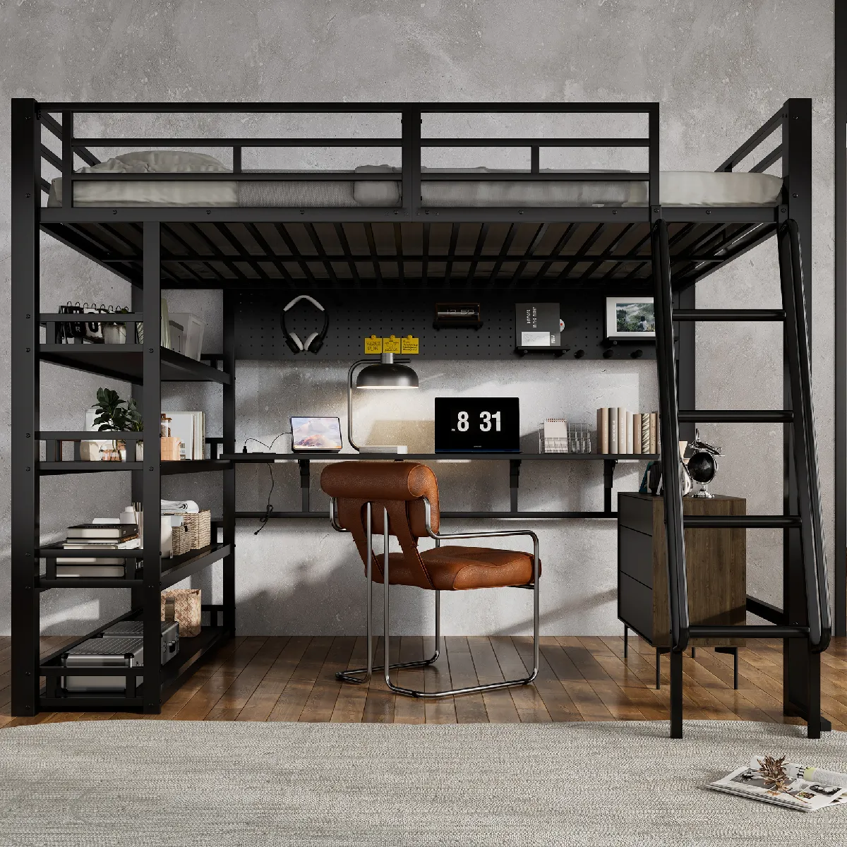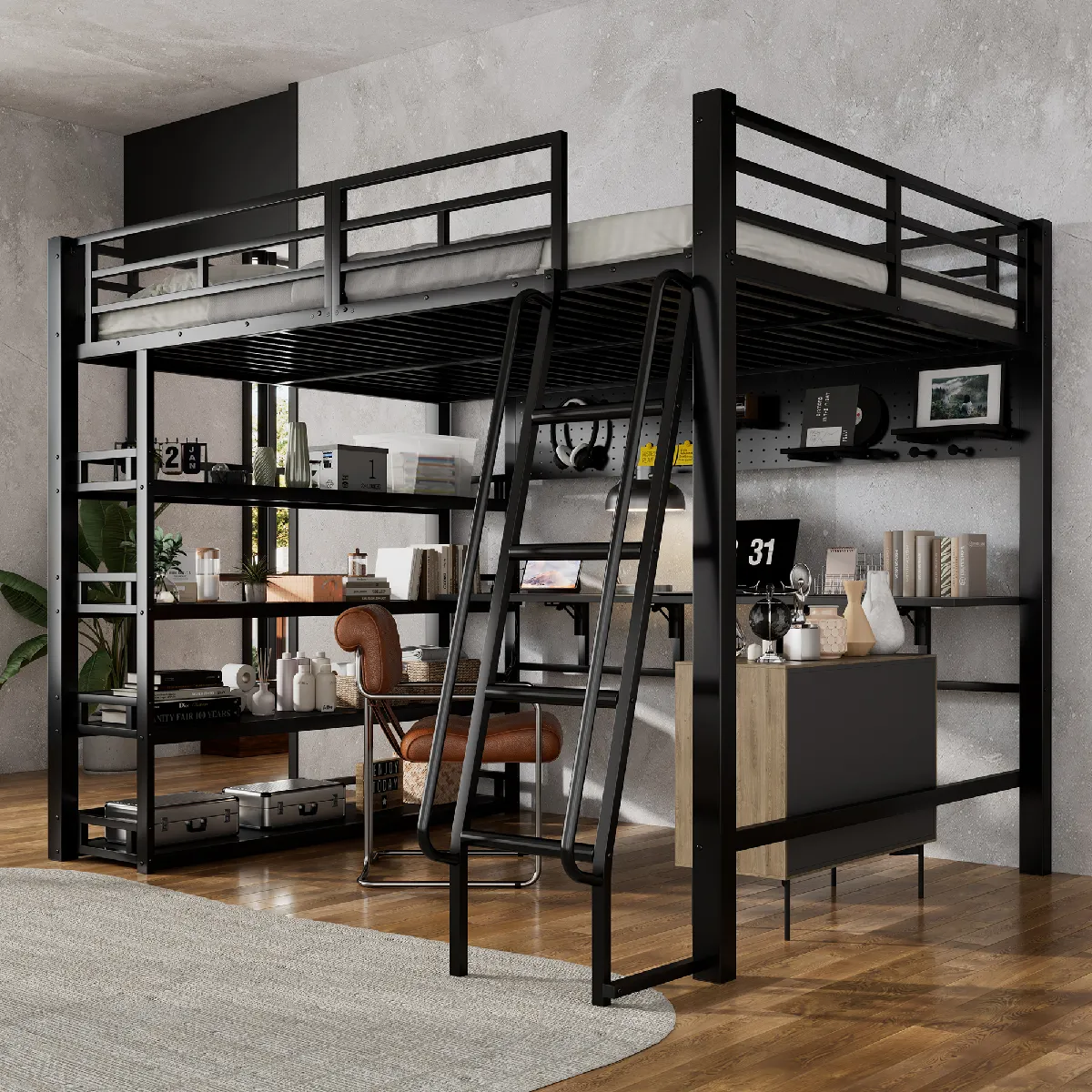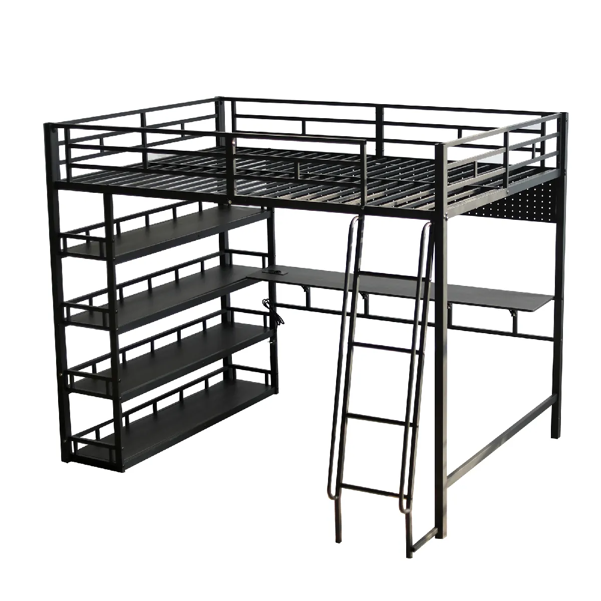 Lit Mezzanine 140x200 cm - Lit Double en Métal avec Nombreux Rangements et Étagères - Échelle 4 Marches - Sans Matelas - Noir
