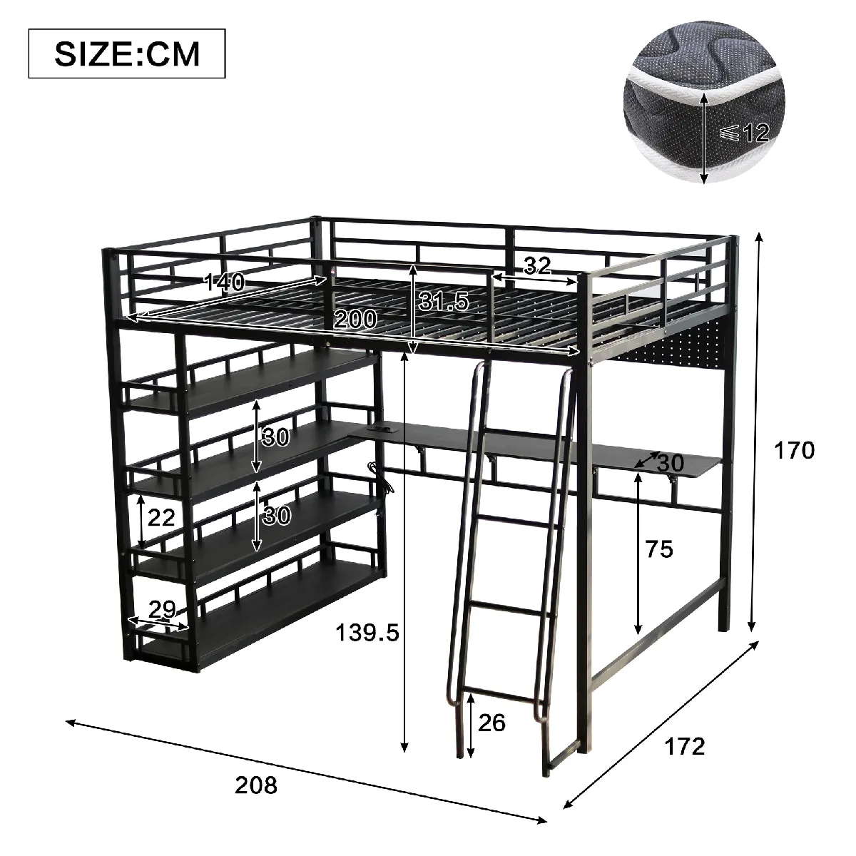 - Matelas compatible (non inclus) : 140 × 200 cm (épaisseur 12 cm)