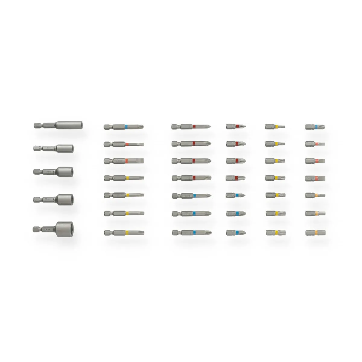 - 40 pièces : 21 embouts 25 mm, 14 embouts 50 mm, 4 noix de serrage, 1 porte-embout magnétique 60 mm