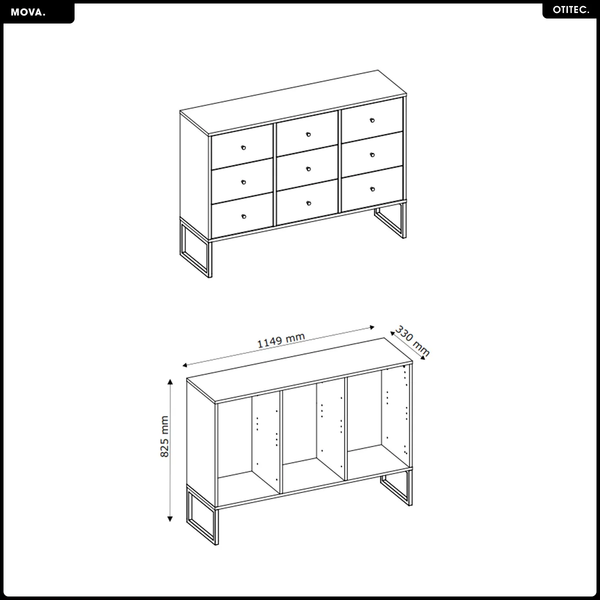 Les neuf tiroirs permettent de segmenter efficacement les catégories comme le linge, les t-shirts ou les accessoires, avec une organisation claire sur une faible profondeur. La largeur de 115 cm propose une façade équilibrée qui valorise la pièce en longueur, et la hauteur de 82,5 cm offre un plateau supérieur utile pour poser lampes, cadres ou boîtes. L'ensemble, sans roulettes, assure une stabilité adaptée à une chambre adulte, tout en conservant un encombrement réduit de 33 cm.