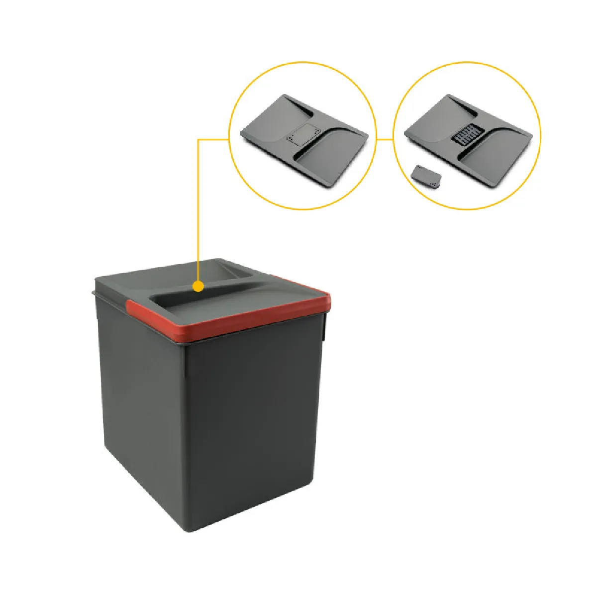 Fabriquée en plastique gris antracite, la poubelle allie robustesse et finition discrète, s'accordant aux cuisines contemporaines tout en résistant à l'usage quotidien.