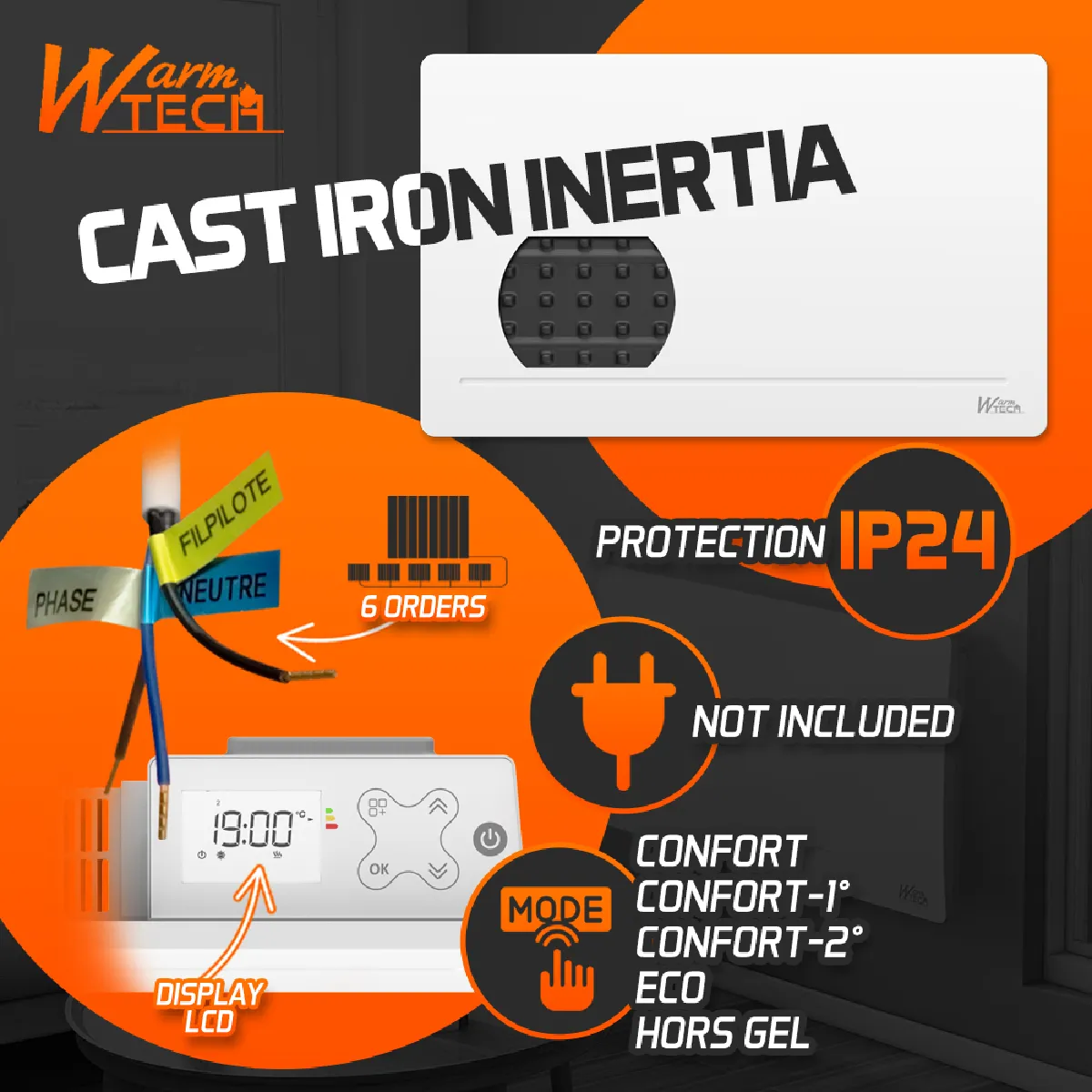 Warm Tech Radiateur inertie fonte 1500 W - IP24 - NF - Fil pilote 6 ordres. |