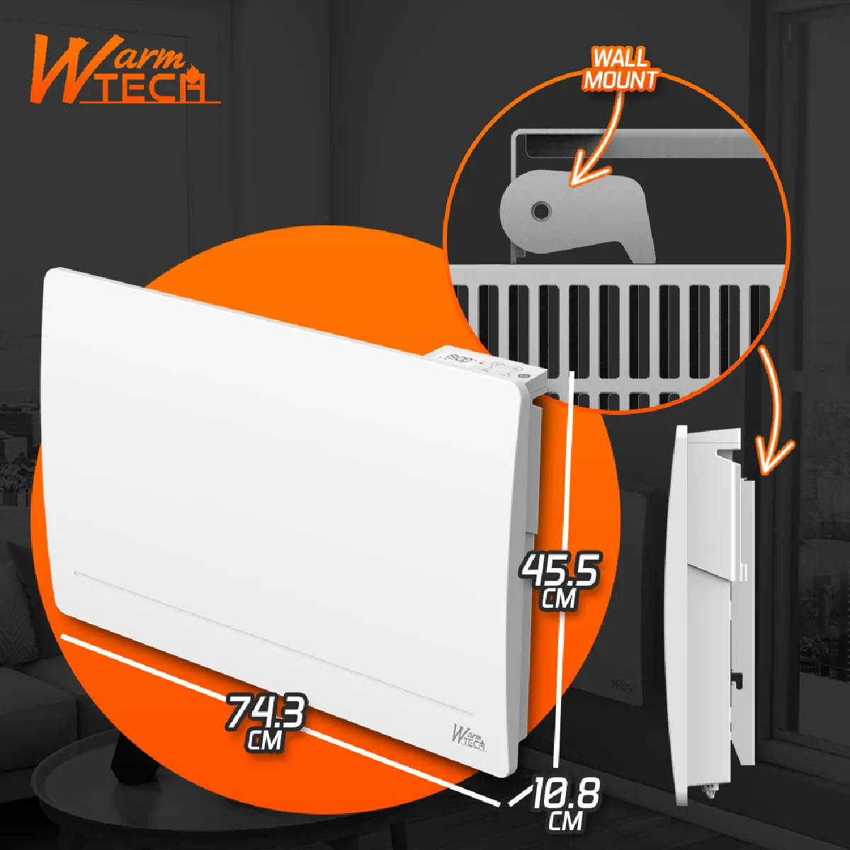 Ce radiateur à inertie sèche est livré avec des fixations murales. Il mesure 74.3 cm de largeur, 45.5 cm de hauteur et 10.8 cm de profondeur.