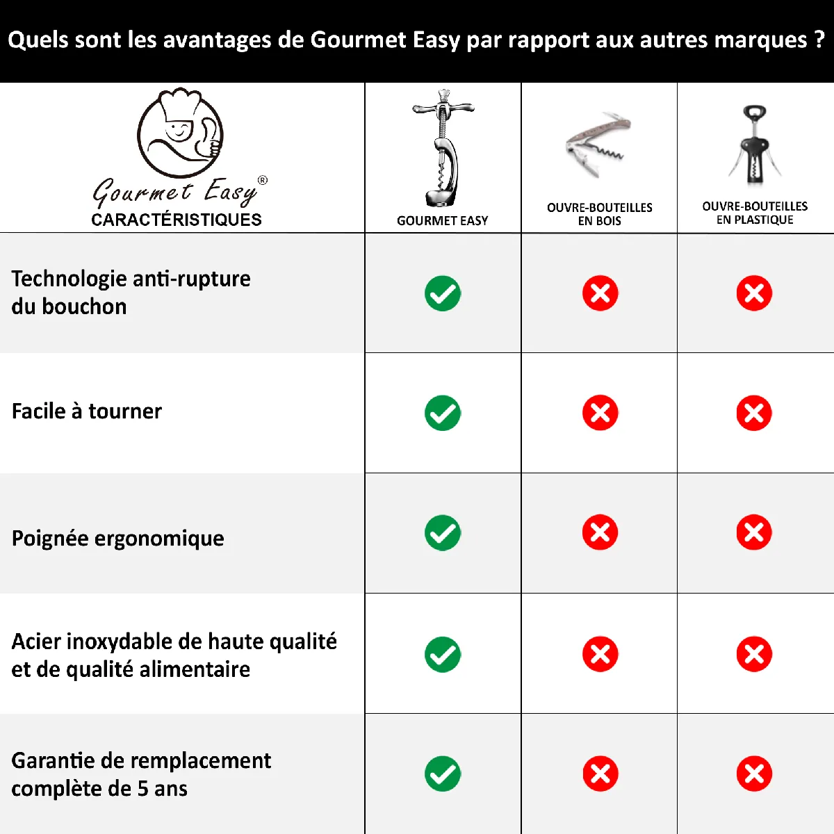 Gourmet Easy Tire-bouchon en acier inoxydable | Ouvre-vin sans résidus de liège | Résistant et élégant | Idéal maison & bar
