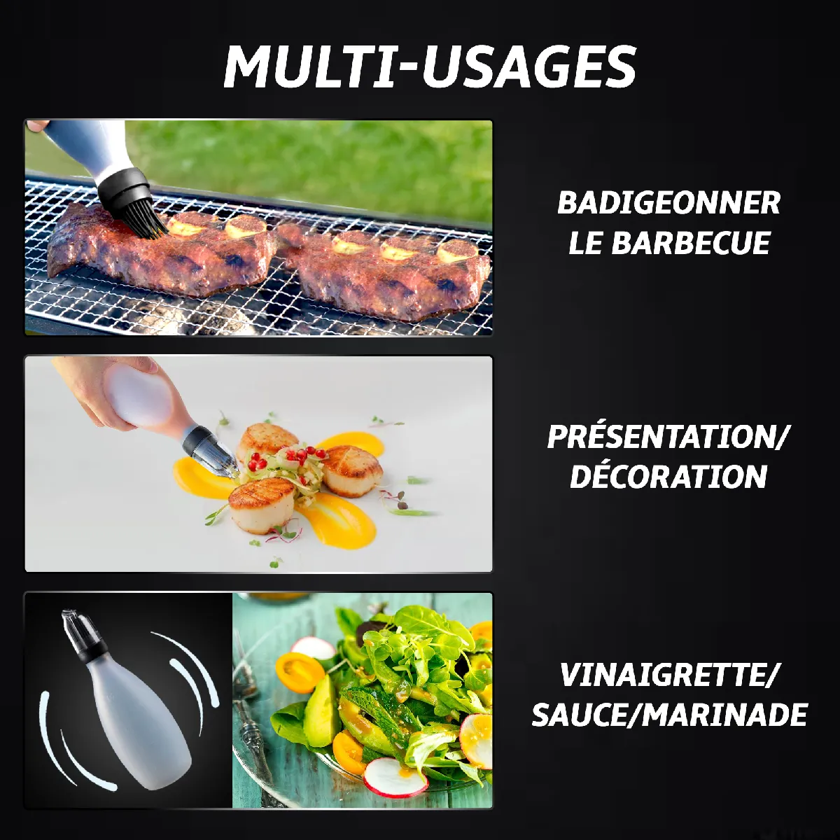MODE DE FONCTIONNEMENT : Comprimer légèrement le distributeur pour verser la sauce dans la partie brosse. Le pinceau à pâtisserie est l'outil de cuisine idéal pour graisser, glacer & badigeonner les aliments avec des marinades, de l'huile, des œufs, du sirop et du beurre.