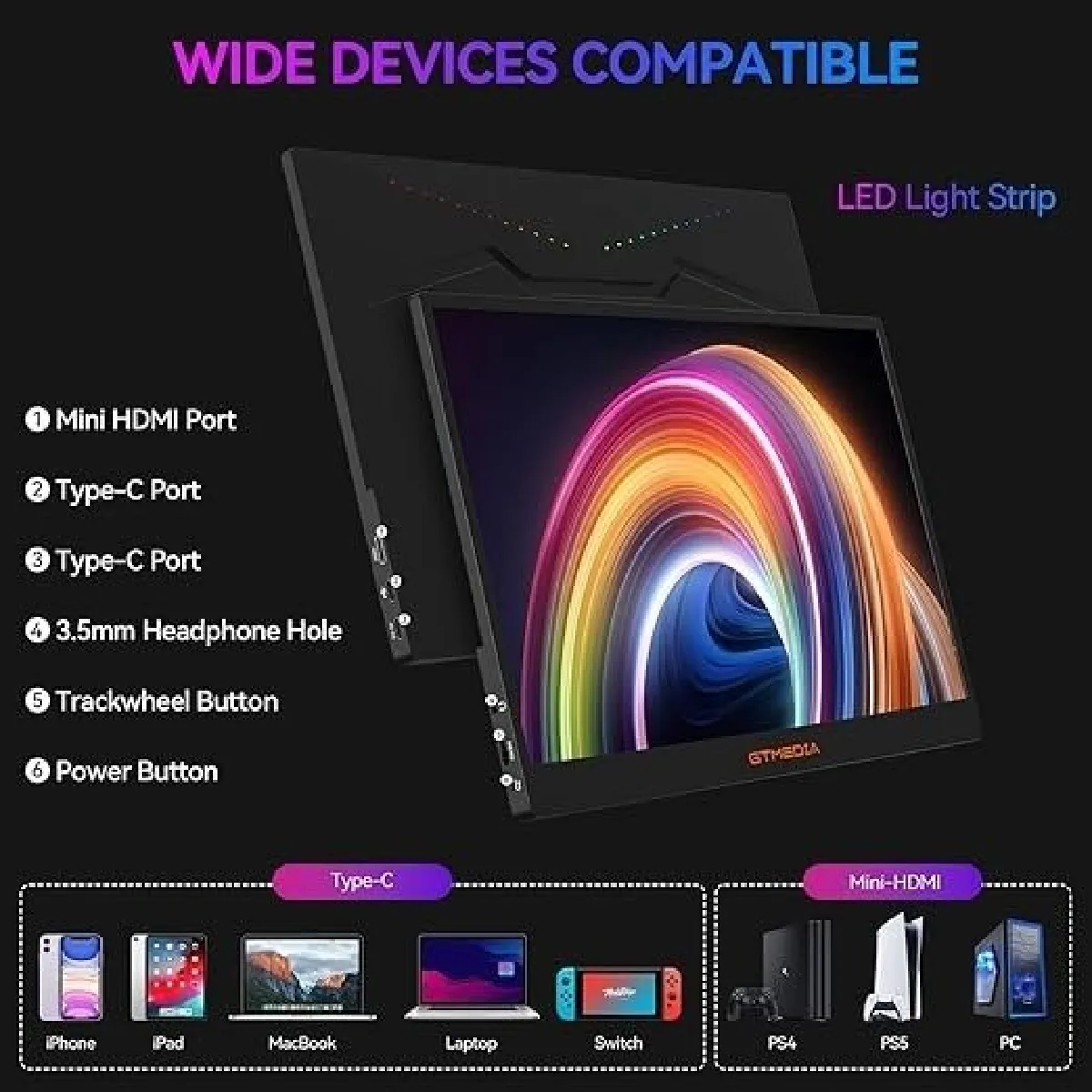 Largement compatible Équipé de 2 ports Typ-C complets et d'1 port HDMI, ce moniteur de voyage pour ordinateur portable se connecte facilement à votre ordinateur portable ou console de jeu avec un seul câble, éliminant le besoin d'installer des pilotes ou des logiciels supplémentaires, offrant une configuration sans tracas et un fonctionnement de jeu instantané. Ce moniteur portable est compatible avec la plupart des téléphones mobiles, ordinateurs portables, Steam Deck, Switch, PS5/4. Contenu : 1 x câble HDMI vers Mini HDMI, 1 x câble USB-C vers USB-C, 1 x moniteur, 1 x cordon d'alimentation, 1 x manuel d'instructionsInformations générales |