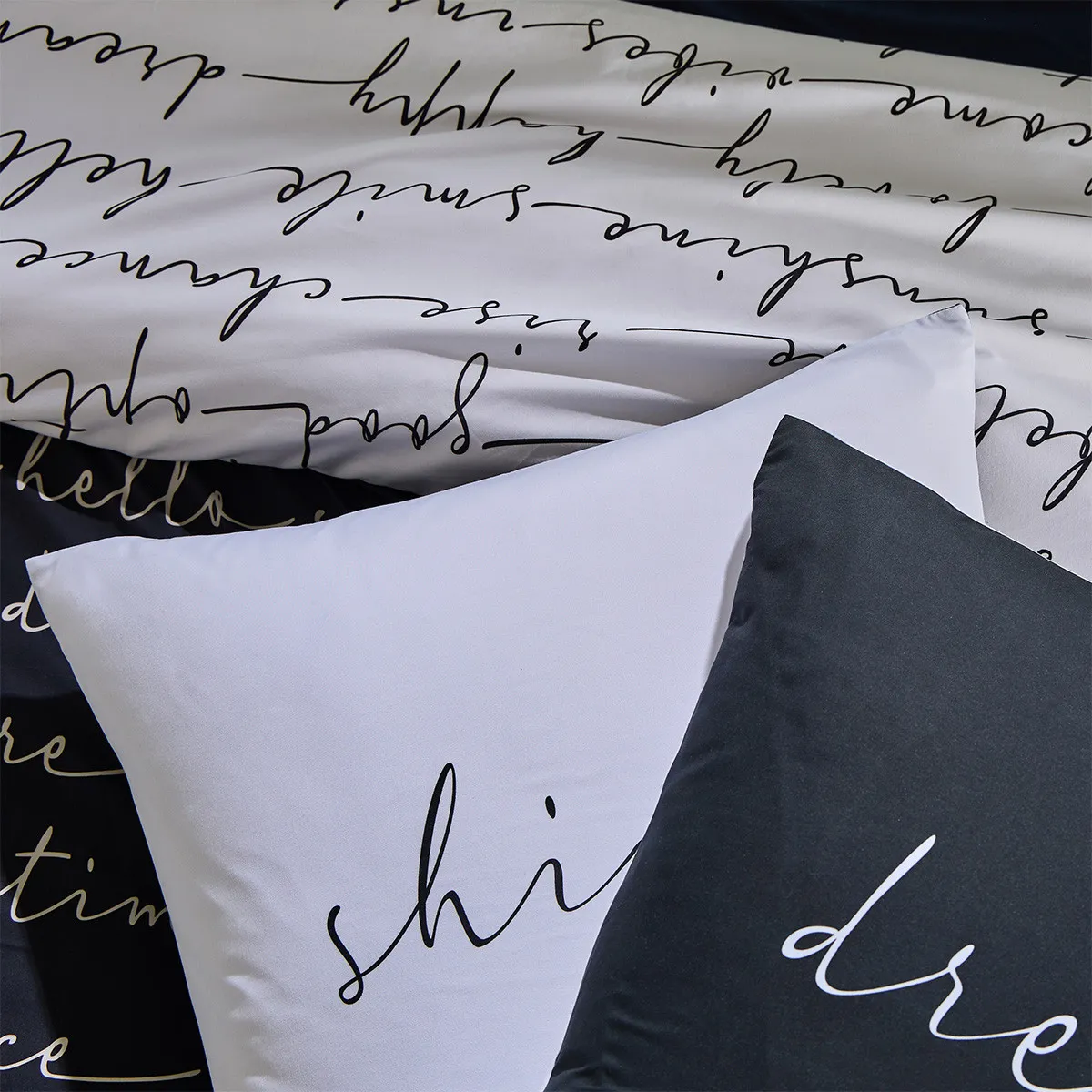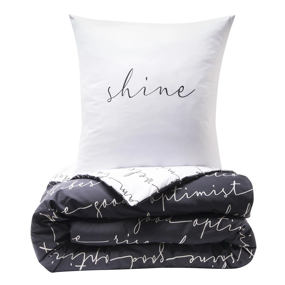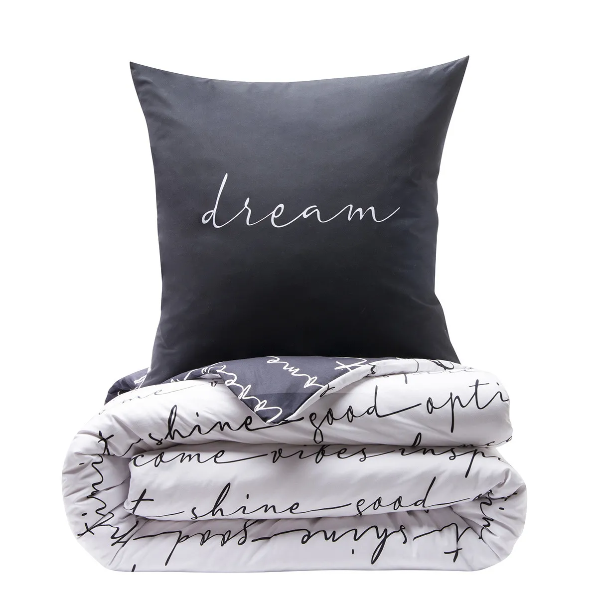 Parure de lit en microfibre réversible imprimé texte noir et blanc RITA comprenant 1 housse de couette + 2 taies d'oreiller 63x63cm.