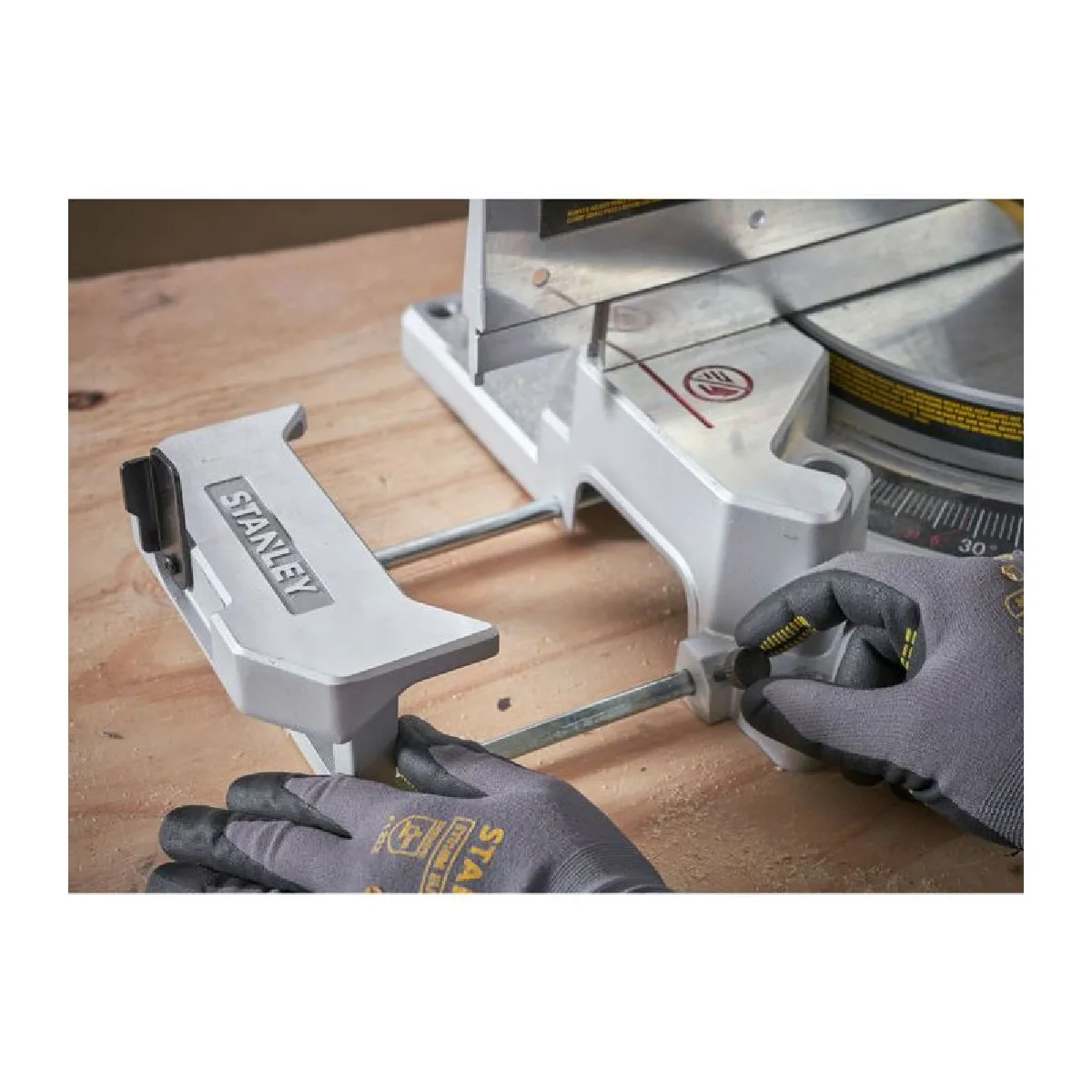 Pour le maintien des pièces, la poignée horizontale ergonomique procure un contrôle stable, tandis qu'une butée arrière de grande dimension soutient l'alignement. Le protège-lame transparent garde la trajectoire visible. Les rallonges latérales télescopiques avec butée apportent un appui pour les longueurs. Les accessoires fournis, dont lame 80 dents, sac à poussières et serre-joint, permettent une mise en route rapide et un flux de travail mieux organisé dès la première utilisation.