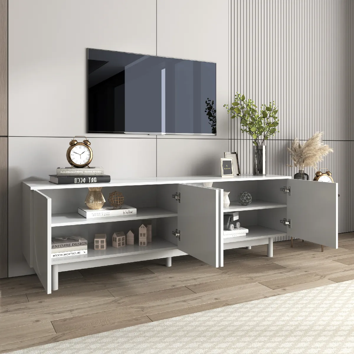 La structure en panneau de particules forme une base stable pour un téléviseur et des périphériques, avec une capacité de charge maximale de 50 kg sur l'ensemble. Les quatre compartiments fermés maintiennent les câbles et accessoires hors de vue, tandis que les tablettes réglables optimisent la hauteur de rangement pour consoles, box ou boîtiers multimédia. L'ouverture Push-to-Open évite les poignées saillantes et contribue à une ligne visuelle continue et épurée dans le séjour.