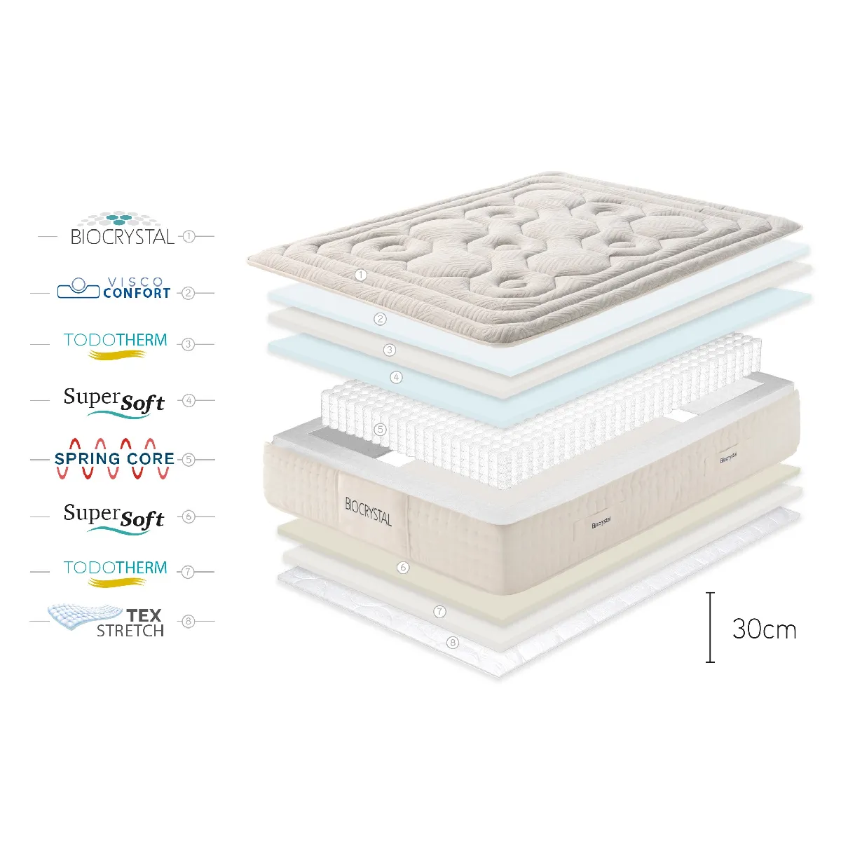MATELAS BIOCRYSTAL SELENIUM SPRING 30 CM: BIOCRYSTAL®, TURMAL.INK, ELECTROSTATIC BALANCE. Le matelas Biocrystal Selenium Spring est conçu avec une structure avancée qui allie confort ergonomique et technologies de bien-être. Son tissu intègre une combinaison exclusive de Biocrystal®, Turmal.ink et Electrostatic Balance, offrant un sommeil aux effets physiologiques et énergétiques. Biocrystal® est une technologie fondée sur un mélange scientifique de cristaux naturels, conçue pour réduire le stress, favoriser la relaxation et améliorer la qualité du sommeil. Son efficacité a été démontrée scientifiquement par des études en double aveugle avec placebo. Les résultats observés sont :