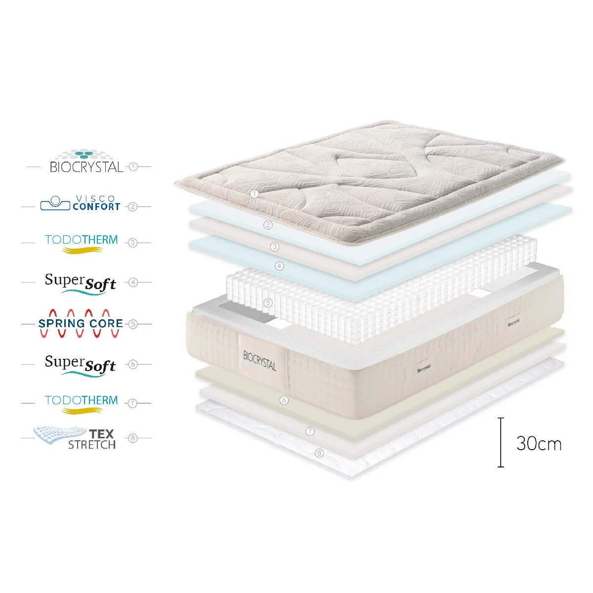 MATELAS BIOCRYSTAL GOLD SPRING 30 CM: BIOCRYSTAL®, TURMAL.INK, ELECTROSTATIC BALANCE. Le matelas Biocrystal Gold Spring est conçu avec une structure avancée qui allie confort ergonomique et technologies de bien-être. Son tissu intègre une combinaison exclusive de Biocrystal®, Turmal.ink et Electrostatic Balance, offrant un sommeil aux effets physiologiques et énergétiques. Biocrystal® est une technologie fondée sur un mélange scientifique de cristaux naturels, conçue pour réduire le stress, favoriser la relaxation et améliorer la qualité du sommeil. Son efficacité a été démontrée scientifiquement par des études en double aveugle avec placebo. Les résultats observés sont :
