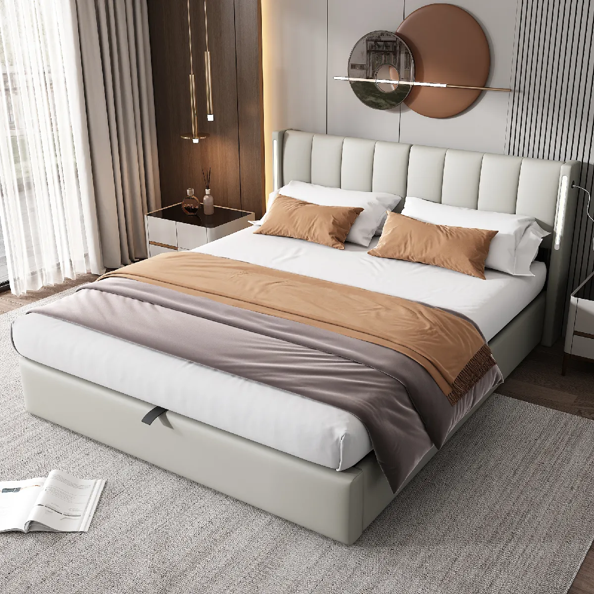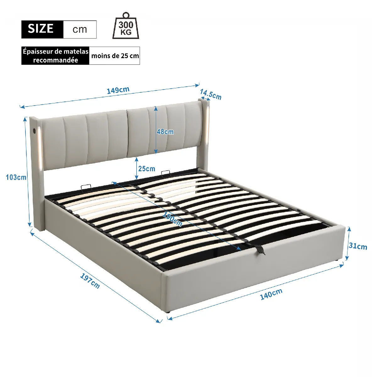 Design contemporain Avec ses lignes épurées, ce lit s'intègre harmonieusement à différents styles modernes, tandis que l'intégration de ports Type-C et d'un éclairage LED apporte une touche technologique raffinée et élégante.