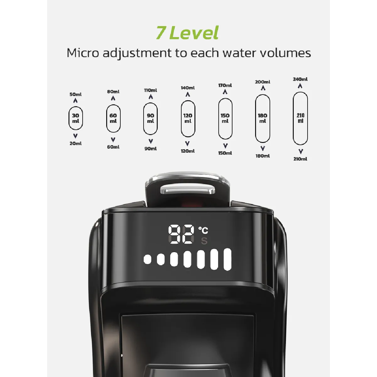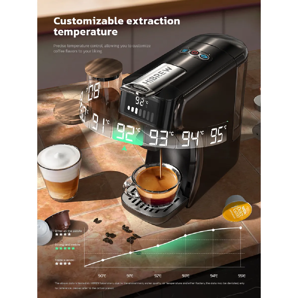 La machine à dosettes expresso dispose de modes froid ou chaud pour que vous puissiez préparer du café glacé en été et du café chaud en hiver. (Le mode CHAUD nécessite environ 35 secondes de préchauffage). NOUVELLE MISE À NIVEAU HiBREW : INDICATEUR DE BARRE LED - Faites correspondre les barres LED aux barres de votre capsule DG*. Veuillez ajuster le volume d'infusion selon vos besoins, une tasse d'espresso italien/lungo/americano savoureux peut être préparée en 1,5 minute !