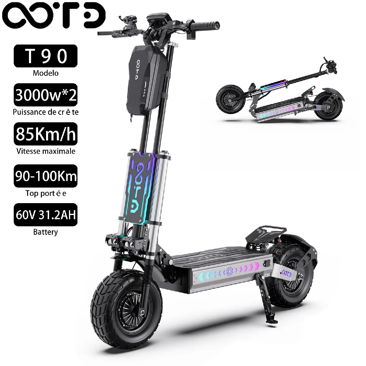 Trottinette électrique Pliable OOTD T90 Double Moteur 3000Wx2 Vitesse Maximale de 85km/h Pour Adultes 60V Batterie 31,2 AH autonomie de 100km