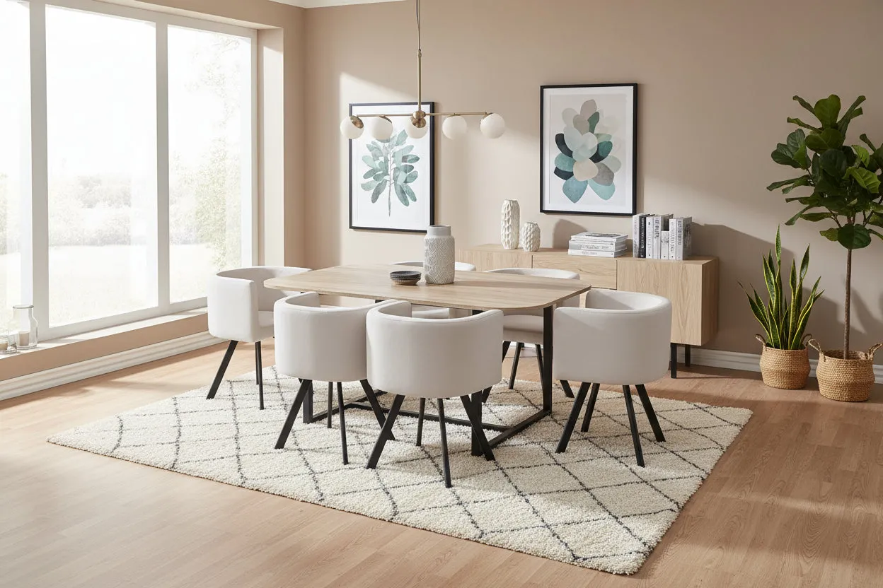 Le matériau en bois de la table soutient une utilisation fiable au fil du temps, tandis que la nature non extensible évite tout réglage et favorise une mise en place immédiate. Les chaises assorties renforcent une ligne esthétique cohérente dans la salle à manger et permettent d'équiper l'espace en une seule solution. L'ensemble se destine à un usage quotidien, avec une mise en valeur discrète des tons neutres pour accompagner la vaisselle et le linge de table.