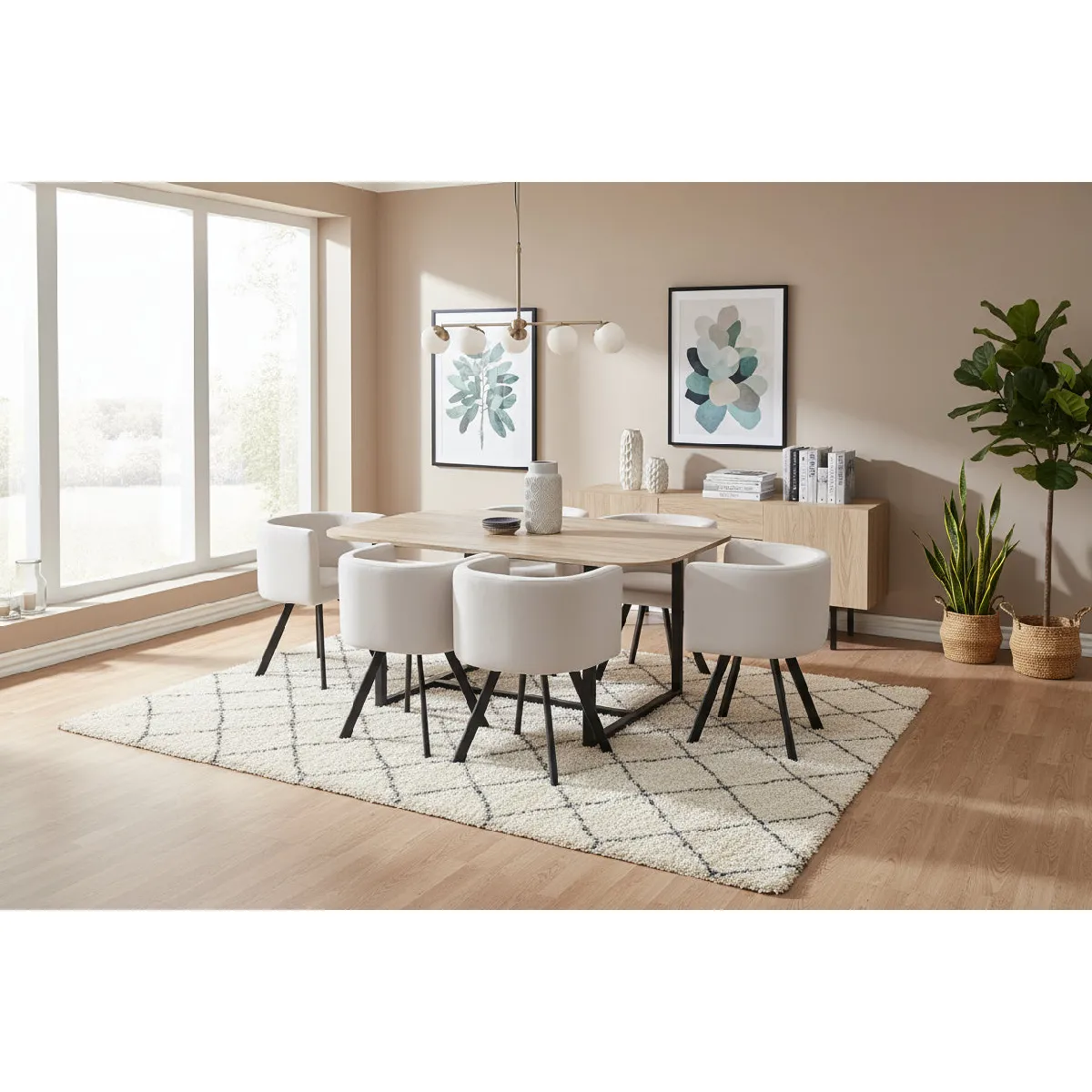 Idéal pour une salle à manger familiale, cet ensemble réunit une table rectangulaire à la surface accueillante et six chaises coordonnées en coloris beige. La table de type à manger propose un format pratique pour réunir confortablement six personnes, tout en conservant une esthétique sobre. Les chaises s'associent harmonieusement à la table, créant une cohérence visuelle élégante autour d'un même ton. La conception non pliable assure une stabilité continue au quotidien. Le choix du bois pour la structure de la table souligne une approche fonctionnelle et durable, pensée pour un usage régulier dans l'espace repas.