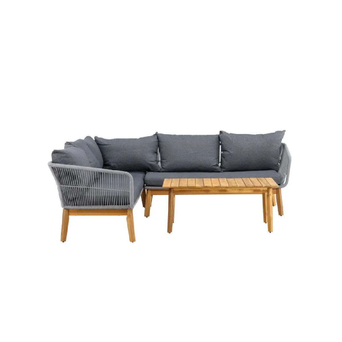 Le format d'angle optimise l'espace extérieur tout en offrant une zone de détente conviviale pour 4 personnes. La structure en bois d'acacia et les coussins épais assurent une assise confortable pour des moments prolongés. La table basse coordonnée facilite la pose de boissons et de accessoires, et la teinte gris avec accents naturels s'intègre à de nombreux styles de terrasse. Le dossier en corde tressée apporte une signature visuelle soignée pour un coin salon adapté aux jardins et balcons spacieux. Les dimensions du canapé de 210/160 cm permettent une installation avec une profondeur maîtrisée pour circuler aisément.