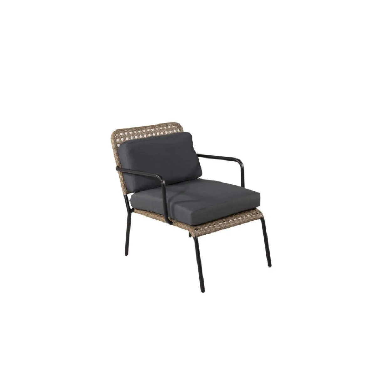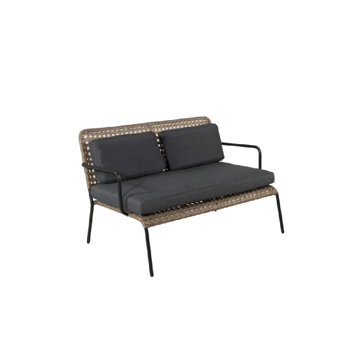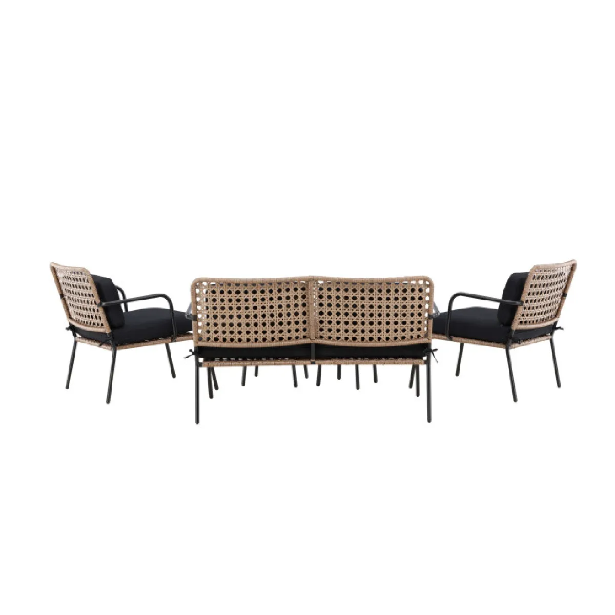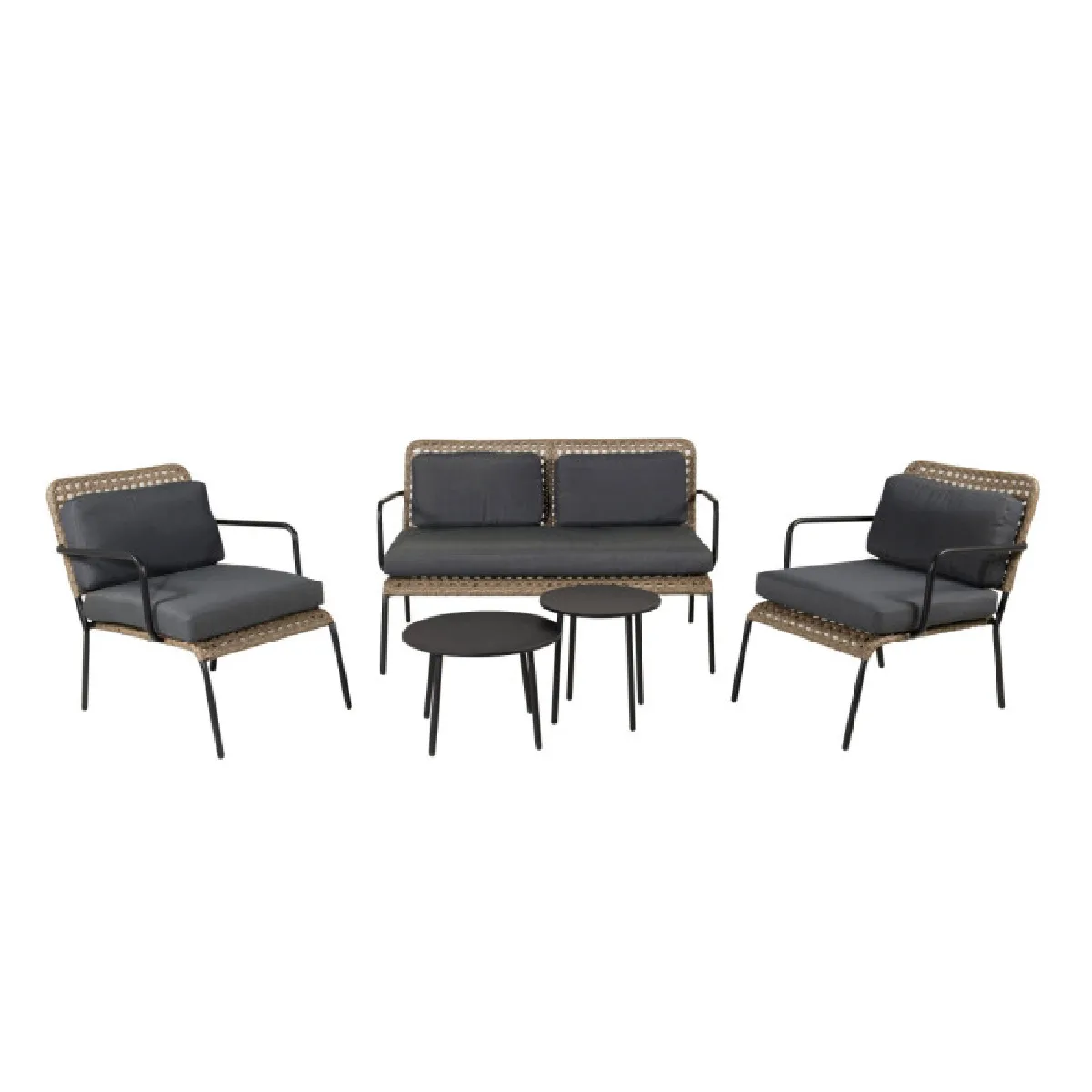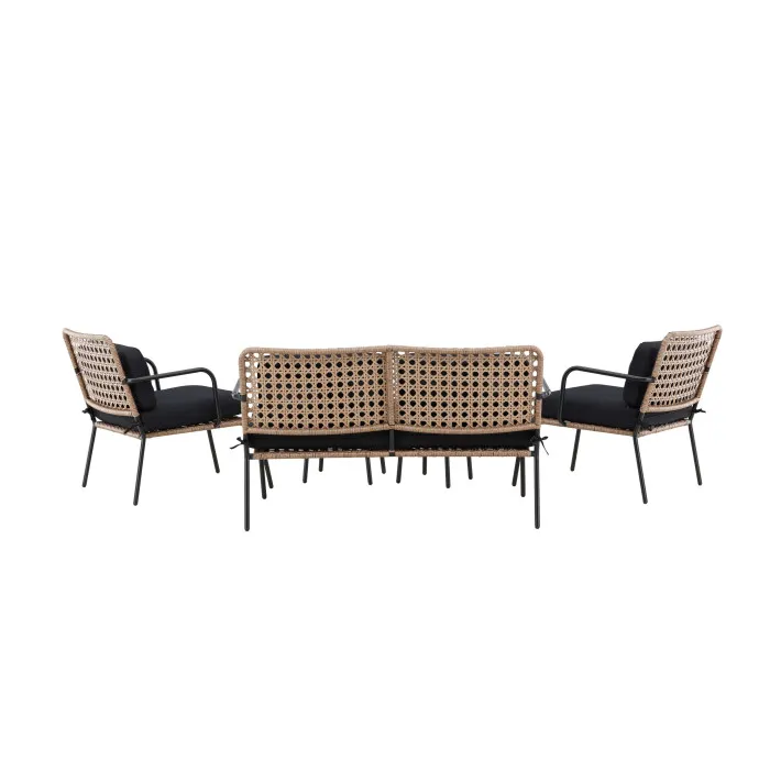 L'ensemble comprend un canapé 2 places de L. 122 x l. 87 x H. 78 cm, deux fauteuils de L. 86 x l. 65 x H. 86 cm et deux tables basses rondes de D. 50 x H. 34 cm. Les accoudoirs du canapé de l. 2,2 x H. 61 cm assurent un appui stable pour l'installation et le relevé. La combinaison de matières Acier, Polypropylène et Polyester forme une structure rigide associée à un tressage visuel effet rotin en coloris naturel & noir.