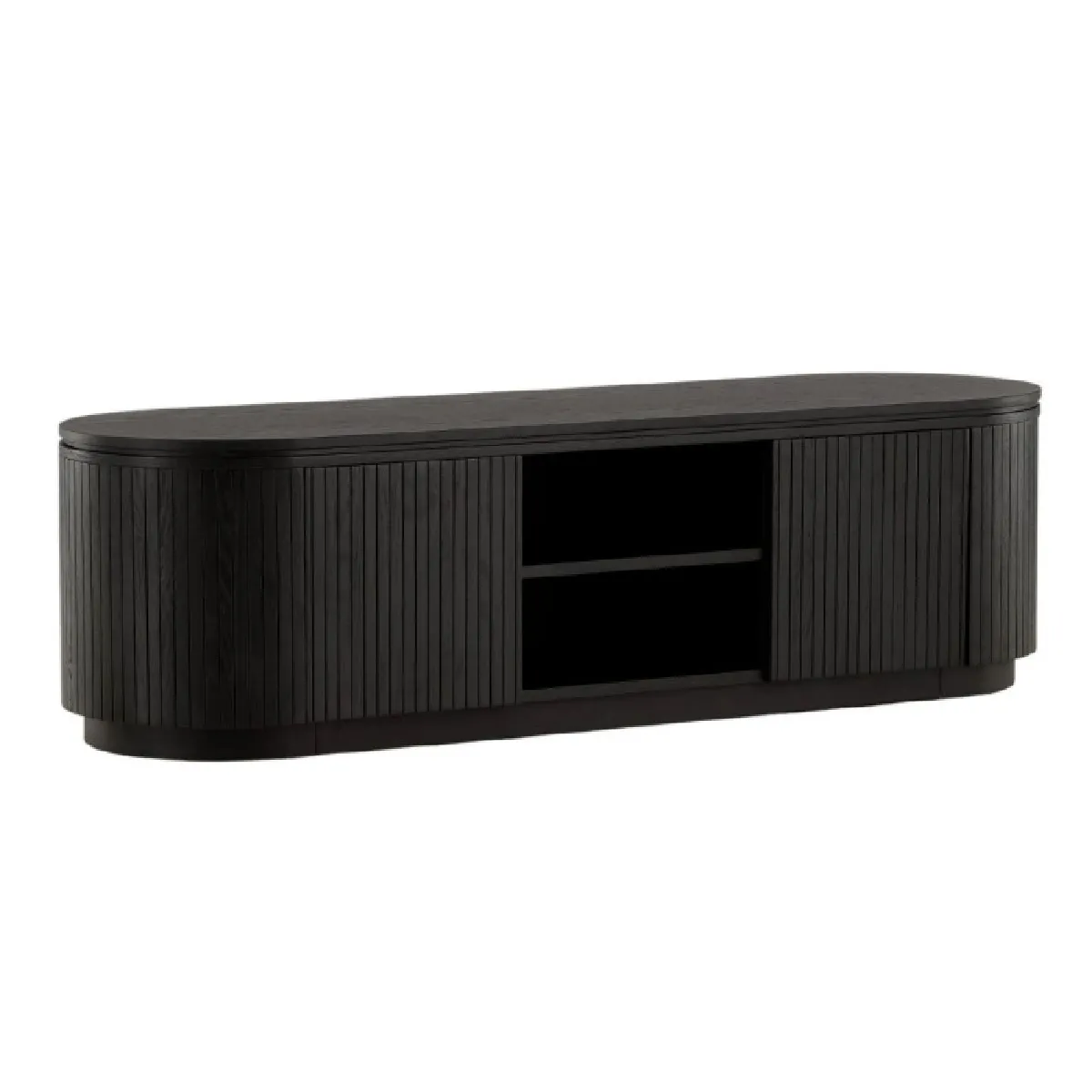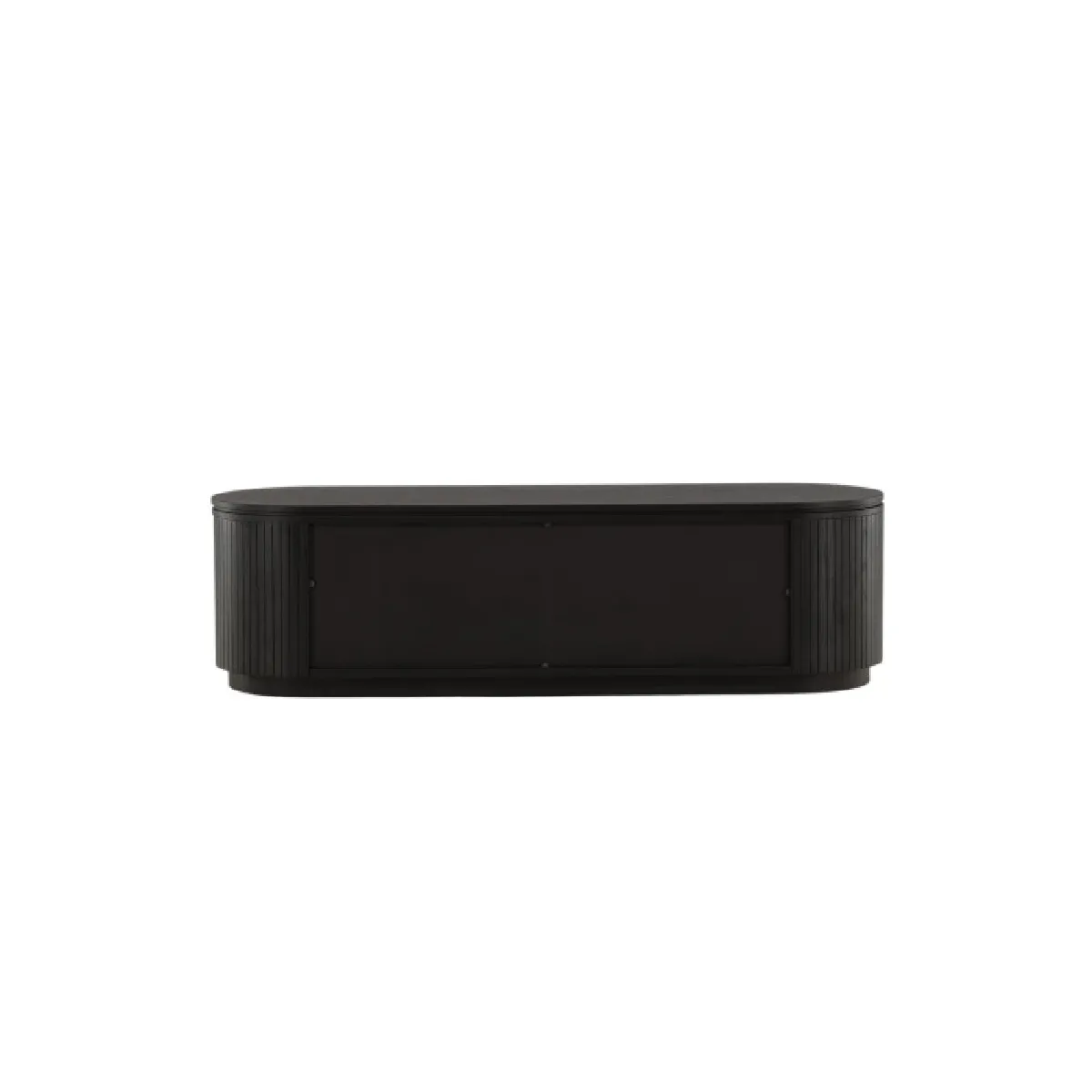 L'ensemble combine deux espaces de rangement fermés et deux étagères ouvertes pour répartir les appareils et accessoires. Les consoles, box et lecteurs trouvent leur place sur la partie ouverte, tandis que les rangements fermés accueillent télécommandes, jeux ou câbles à l'abri des regards. Avec une longueur de 160 cm et une profondeur de 48 cm, la surface supérieure prend en charge un téléviseur et une barre de son, dans la limite de 50 kg. Le design nervuré apporte une texture visuelle qui souligne la finition noire sans surcharger la pièce.