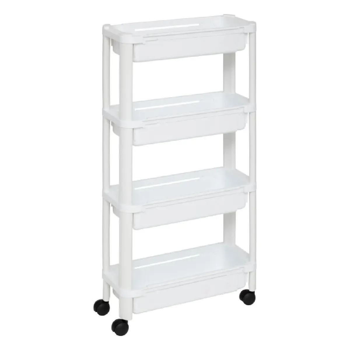 Un rangement supplémentaire se glisse facilement où l'espace manque grâce à cette desserte étroite et conçue pour optimiser les zones résiduelles entre meubles et appareils. Son format vertical offre quatre niveaux accessibles pour les épices, produits d'entretien ou conserves. La structure en polypropylène résiste aux usages du quotidien et se nettoie rapidement. Les roulettes intégrées facilitent le déplacement pour un accès immédiat au contenu. Sa teinte blanche s'intègre discrètement dans une cuisine ou une buanderie, sans alourdir l'ensemble. Cette solution modulable répond aux besoins d'organisation tout en restant compacte et maniable même dans un couloir ou un cellier étroit.