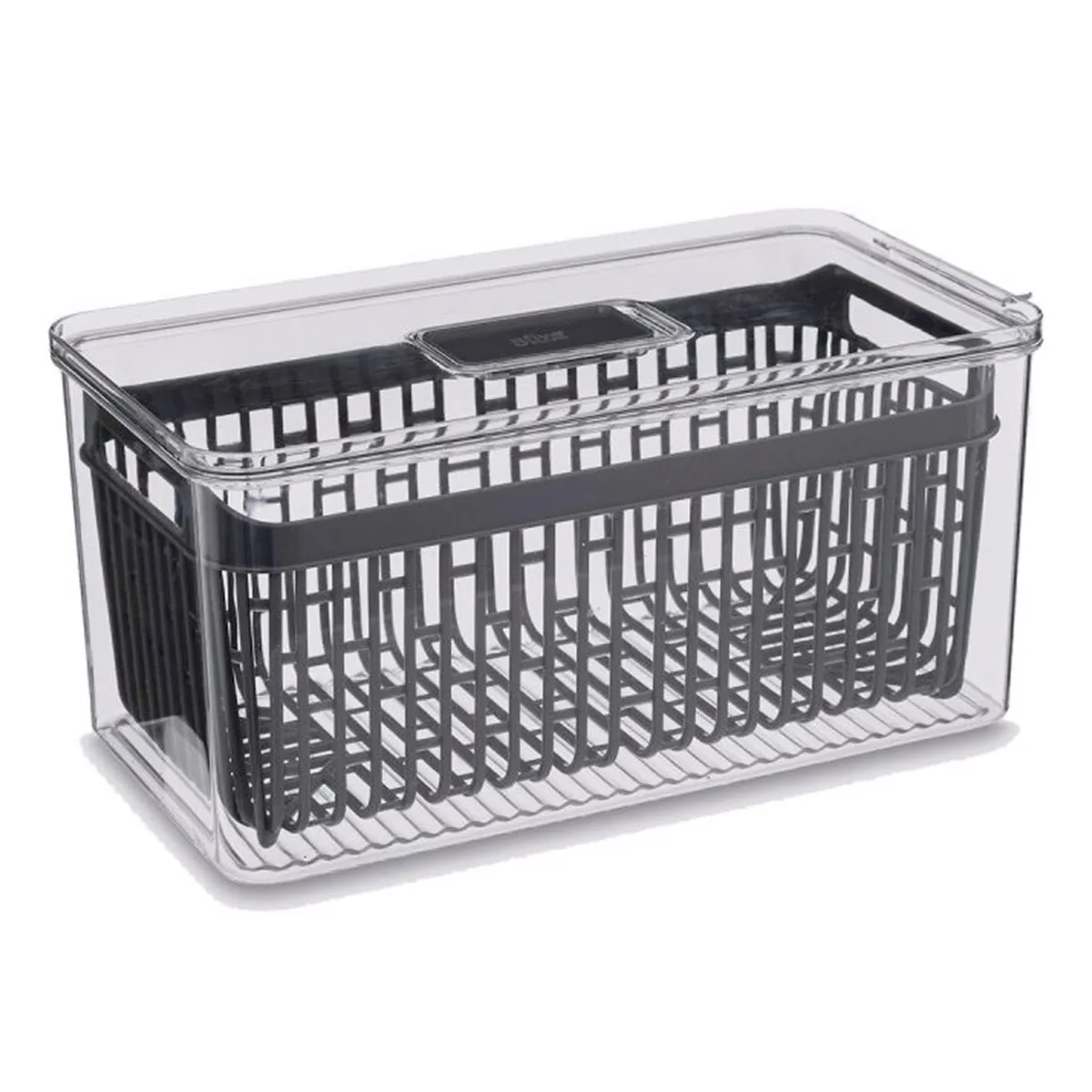 Commentaire vendeur : Informations Techniques : Dimensions : L. 32,5 x l. 15 x H. 16,4 cm Matière : PET Spécificités : Chic & Tendance Boîte de Conservation Pour Frigo Valve de Ventilation Panier 2 en 1 Passoire Anti-Moisissures Boîtes Empilables Contact Alimentaire Poids : 0,808 kg Couleur : Gris & Transparent