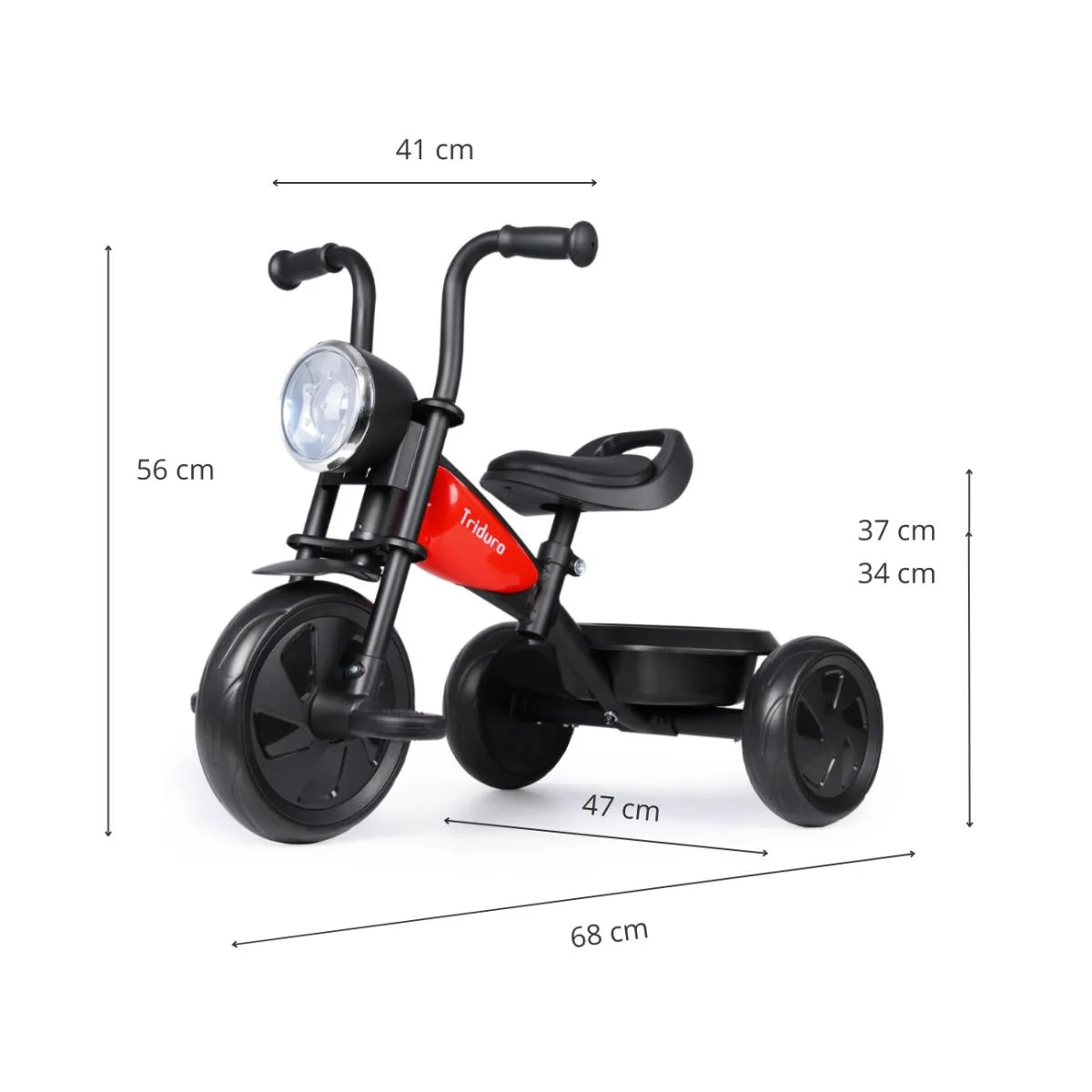 Grâce à son design évoquant un mini-moto, avec faux réservoir et lampes LED clignotantes, il stimule l'imagination des enfants de 2 à 6?ans tout en restant stable grâce à sa base à trois roues et ses pneus en mousse piquée. La structure métallique robuste supporte jusqu'à 25?kg, pour un poids d'environ 4,6?kg, emballage inclus.