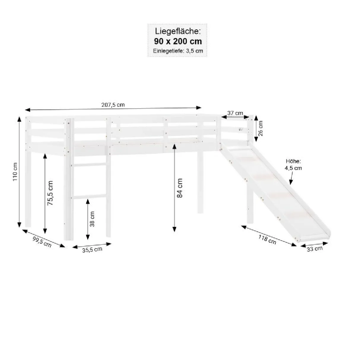 Homestyle4U Lit mezzanine 90x200cm avec toboggan et rideau pin pêche |