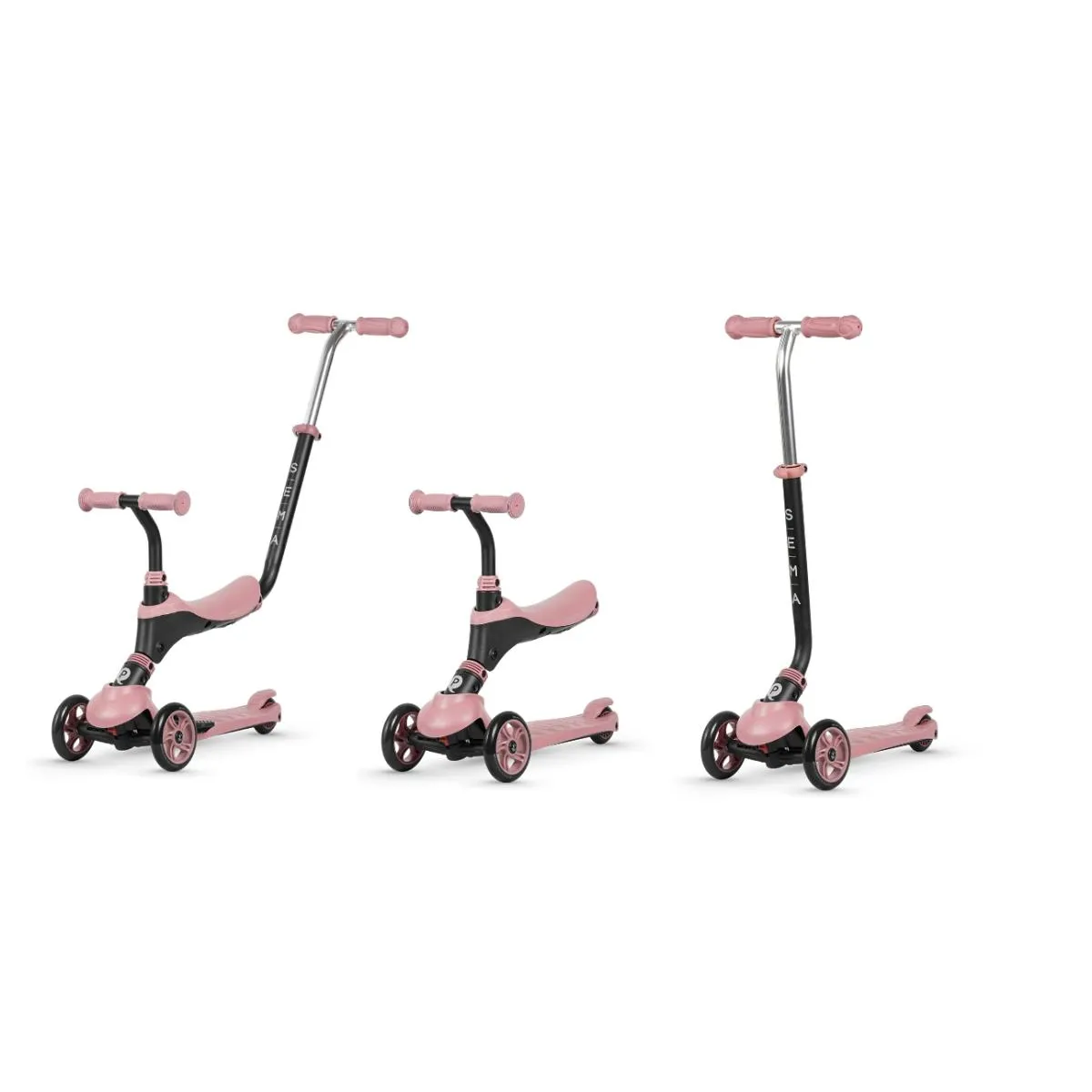 Découvrez la trottinette évolutive Qplay Sema 3-en-1 rose, le compagnon parfait de 1 à 6 ans ! Elle s'adapte à la croissance de votre enfant en trois modes : porteur avec poignée parentale, porteur autonome, puis trottinette.