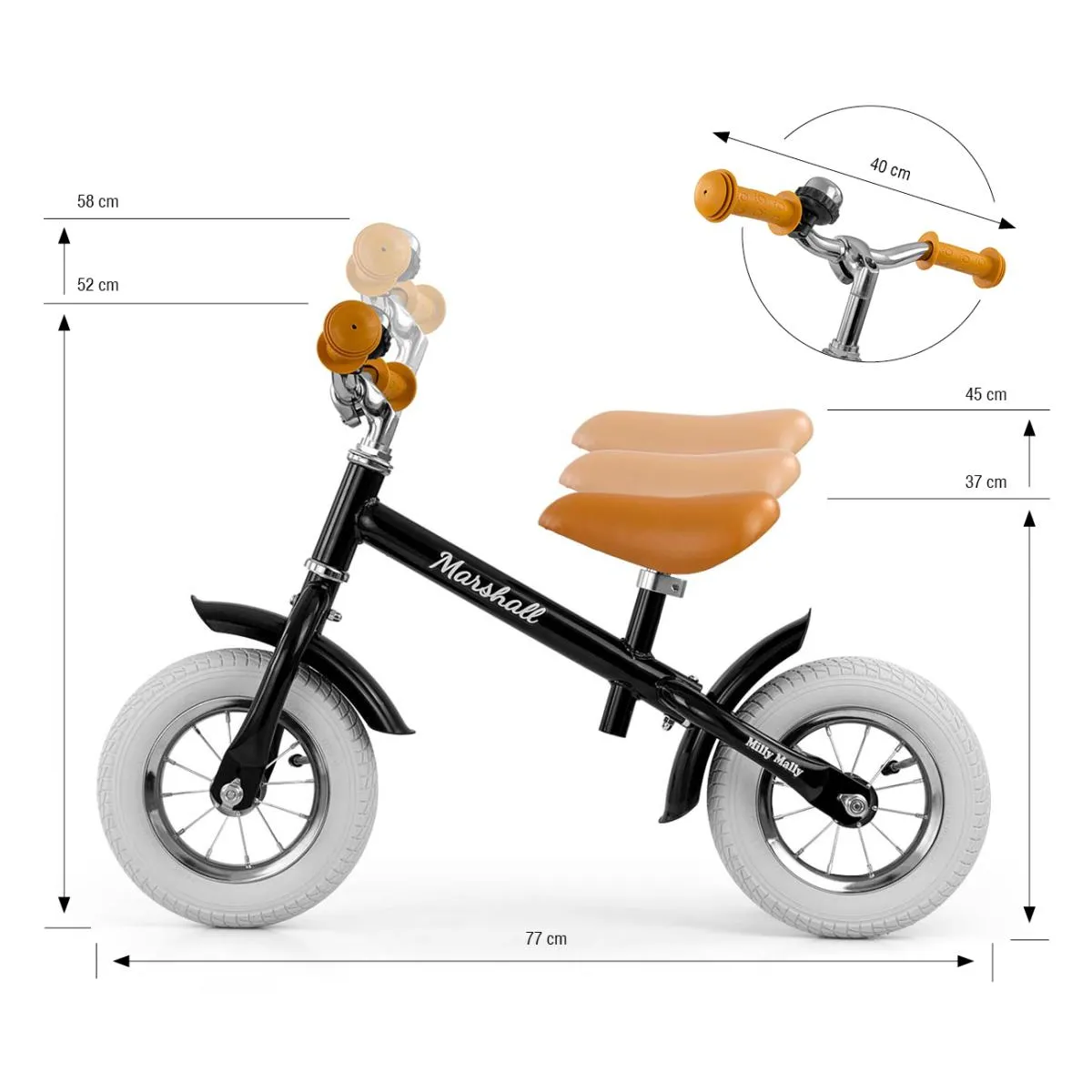 Le vélo d'équilibre Milly?Mally?Marshall?Air?Black est idéal pour les enfants dès 2?ans, avec une capacité de charge maximale de 20?kg. Il est doté d'un cadre en acier léger et durable, fini avec une peinture résistante aux rayures. Les larges roues gonflables de 10? assurent un roulement confortable et silencieux, tout en absorbant les chocs. Le guidon s'ajuste de 52 à 58?cm et la selle de 37 à 45?cm, avec vis de sécurité pour éviter tout glissement. La selle ergonomique rembourrée offre un bon confort, et la direction, fluide grâce aux roulements intégrés, garantit un usage sécurisant et naturel sans besoin de pédales. Il mesure environ 77?cm de long, 40?cm de large au guidon, et pèse 4?kg (environ 4,75?kg emballé). Ce modèle combine robustesse, confort et ajustabilité pour accompagner l'apprentissage de l'équilibre dès le plus jeune âge.