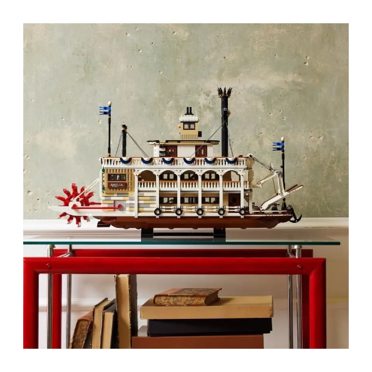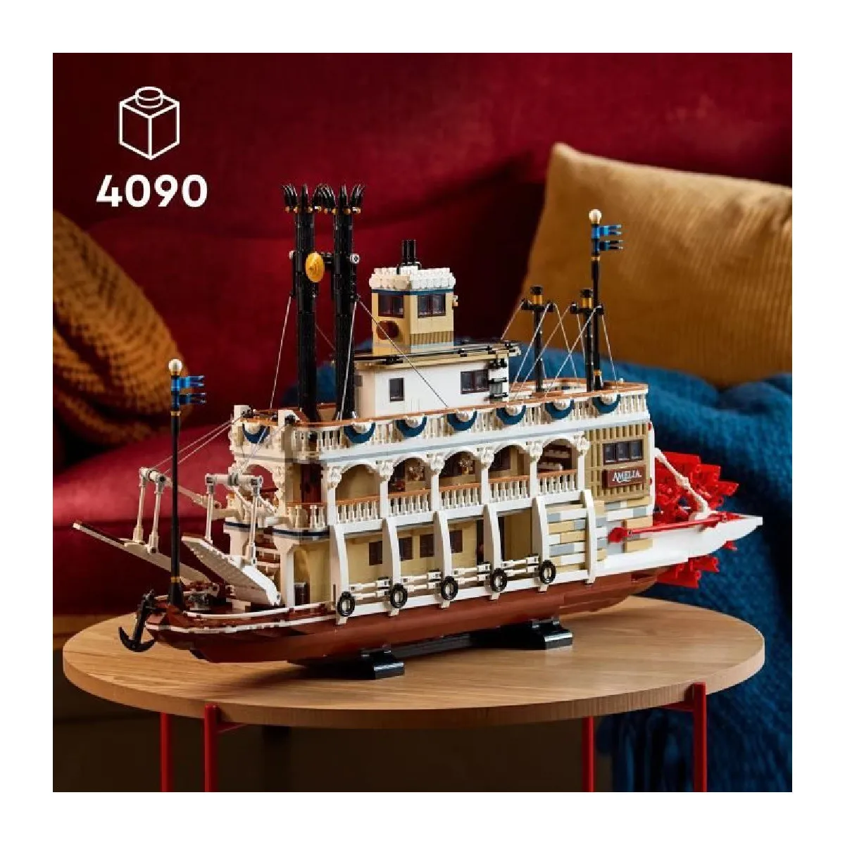 La construction de 4090 pièces offre une restitution minutieuse d'un bateau à vapeur du Mississippi, pensée pour l'affichage sur une étagère ou un bureau. Le modèle LEGO Ideas 21356 se distingue par des ponts amovibles permettant d'explorer l'intérieur : wheelhouse, texas deck, main deck et boiler deck. Les roues à aubes s'animent lorsque la maquette se déplace, tandis que la commande du gouvernail s'actionne via la roue ou un bouton externe. L'ensemble met en avant une machine à vapeur reproduite avec des éléments techniques, pour une approche à la fois pédagogique et fidèle aux principes historiques.
