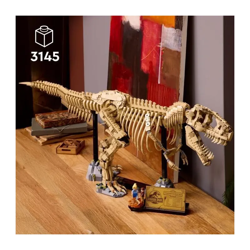 Un montage de 3145 pièces permet d'obtenir un squelette de Tyrannosaurus rex articulé à l'échelle 1/12, adapté à une présentation soignée à la maison ou au bureau. La tête, la mâchoire, les bras et la queue sont pleinement mobiles pour varier les poses, tandis que le support avec plaque descriptive stabilise l'ensemble pour une exposition durable. Les deux minifigurines d'Ellie Sattler et d'Alan Grant complètent la scène avec un site de fouilles ponctué d'éléments surprises, dont un morceau d'ambre.
