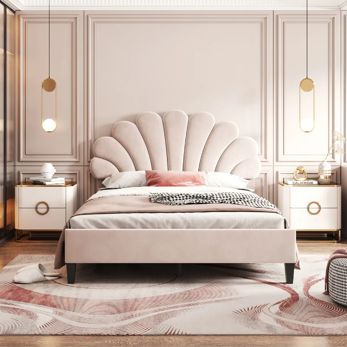 Blossom Paris Lit capitonné double 140x200, cadre tête de lit fleuri, sommier, velours, beige.