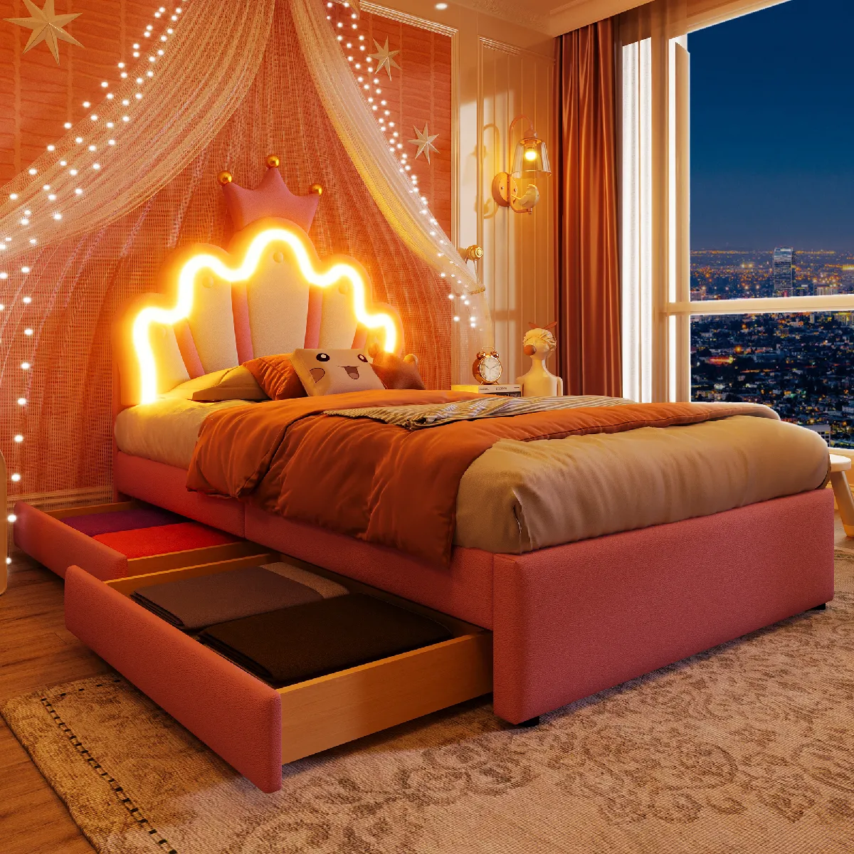 Blossom Paris Lit princesse 90x200 rose couronne, LED, 2 tiroirs, tête réglable