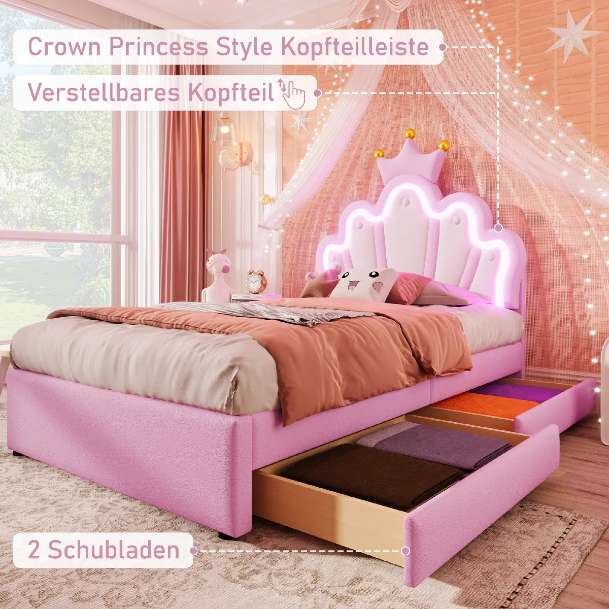 Blossom Paris Lit princesse 90x200 rose couronne, LED, 2 tiroirs, tête réglable |