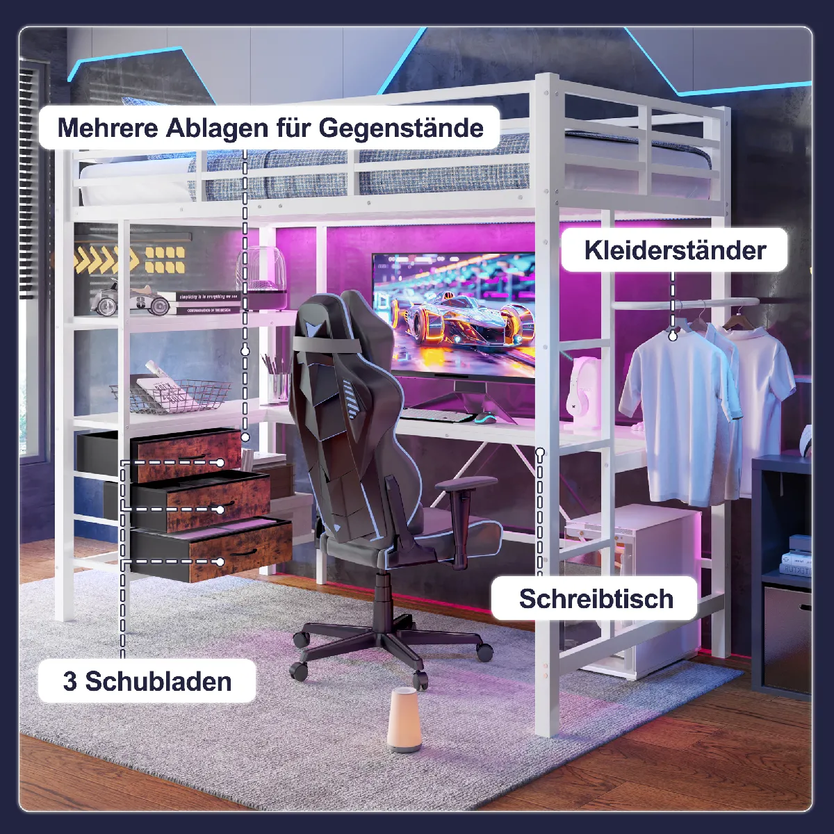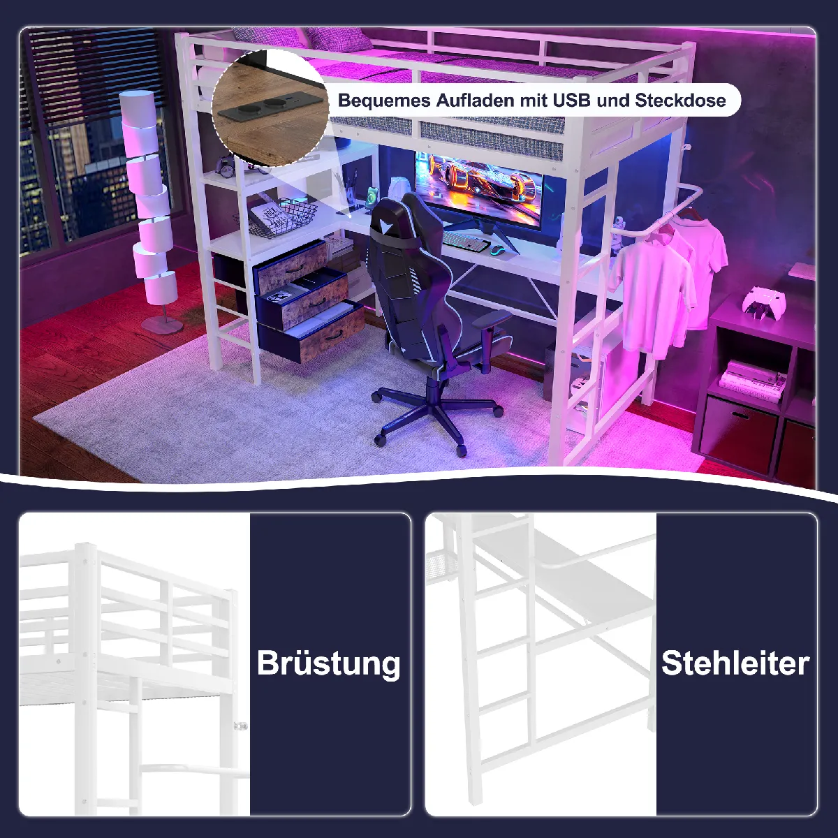 Lit mezzanine 90 x 200 cm avec éclairage d'ambiance télécommandé, bureau, prise électrique et port USB, 3 tiroirs. Fabriqué en fer et MDF de haute qualité, ce lit mezzanine est robuste et durable. Un bandeau lumineux sous le lit crée une ambiance chaleureuse et confortable la nuit. Il est équipé de trois tiroirs spacieux, d'une étagère pratique et d'une barre de séchage pour répondre à tous vos besoins de rangement. Le bureau spacieux offre un espace de travail confortable pour étudier ou travailler, et la prise électrique et le port USB intégrés permettent de recharger facilement vos appareils. La conception soignée de la rambarde et de l'escalier garantit la sécurité de votre famille. Optez pour ce lit et embellissez votre intérieur. Description + Dimensions Matériaux du lit : Métal + MDF Dimensions : 90 x 200 cm Couleur : Noir/Blanc Nombre de colis : 2 Assemblage requis : Oui Origine : Chine Dimensions du produit : 204,5 x 98 x 180,5 cm Dimensions du colis : Voir les spécifications Dimensions intérieures du lit : 90 x 200 cm Hauteur totale : 180,5 cm Charge maximale : 240 kg Épaisseur de matelas recommandée (sans matelas) : 10 cm Remarques ? Une marge d'erreur de 2 à 3 cm est possible en raison de la mesure manuelle. ? Les images présentées sont celles du produit réel, mais de légères différences de couleur peuvent apparaître en raison de l'éclairage et d'autres facteurs. ? Ce produit sera expédié en 2 colis. La livraison peut donc être différée. Merci de votre patience. ? Pour toute question lors du montage, veuillez nous contacter au plus vite.