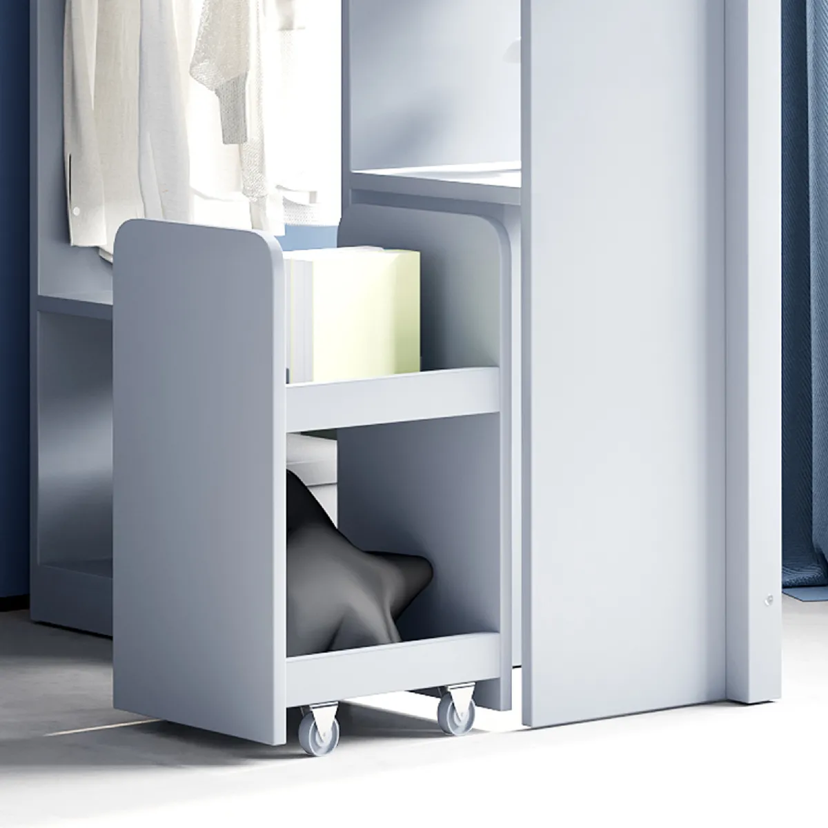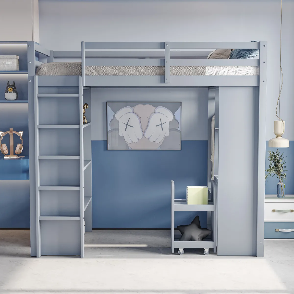Blossom Paris Lit mezzanine enfant 90x200 cm, étagères multiples, cintres, chariot, rangement, gris.