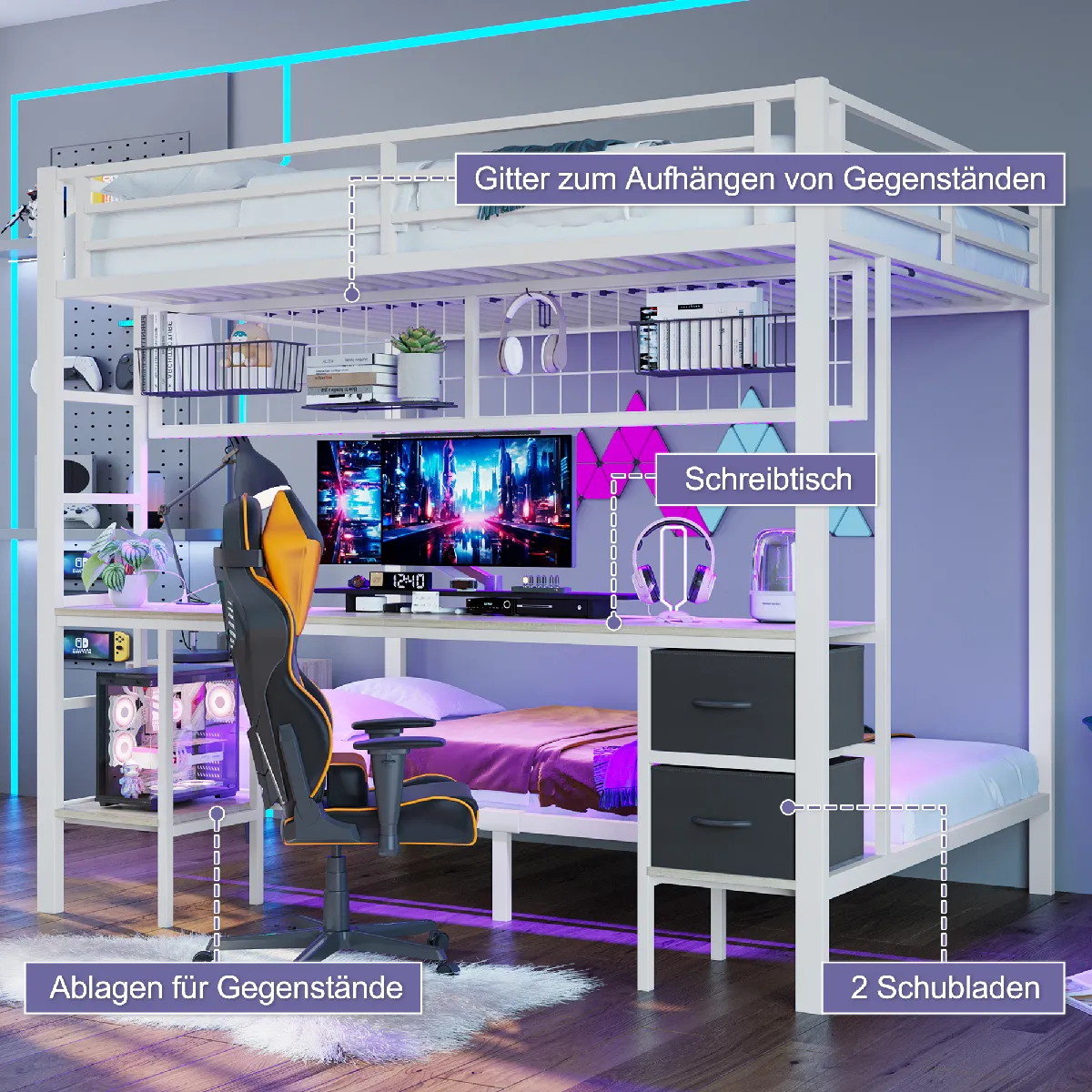 Blossom Paris Lit mezzanine 90/140x200 métal blanc avec LED 7 couleurs, bureau et ports USB