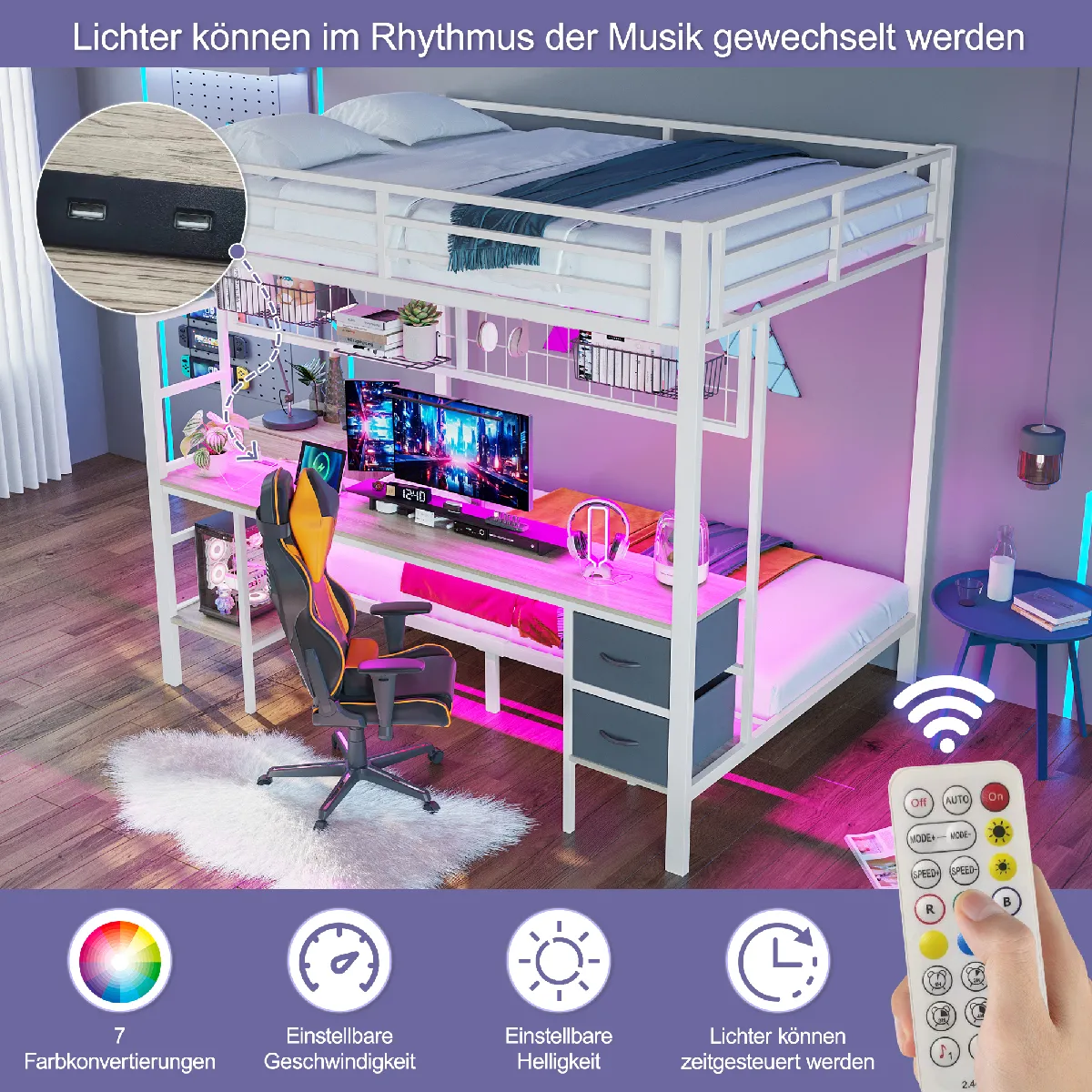Blossom Paris Lit mezzanine 90/140x200 métal blanc avec LED 7 couleurs, bureau et ports USB |