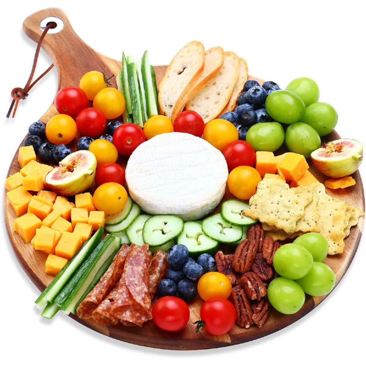 Apportez élégance et fonctionnalité à votre cuisine avec cette planche à découper ronde en bois d’acacia premium. Durable, stable et conforme aux normes de sécurité alimentaire, elle est idéale pour couper pain, fromages, viandes, légumes, fruits ou pizzas. Elle se transforme également en plateau de service ou planche à charcuterie pour des présentations élégantes lors de dîners ou fêtes. Sa surface lisse et polie à la main offre un toucher agréable et sans bavures, tandis que la poignée arrondie permet un transport facile. Disponible en tailles 12'' et 16'', elle convient parfaitement pour un usage quotidien ou des occasions spéciales. Livrée dans une élégante boîte cadeau kraft, elle constitue un cadeau pratique et raffiné pour mariages, pendaisons de crémaillère, anniversaires ou toute autre célébration.