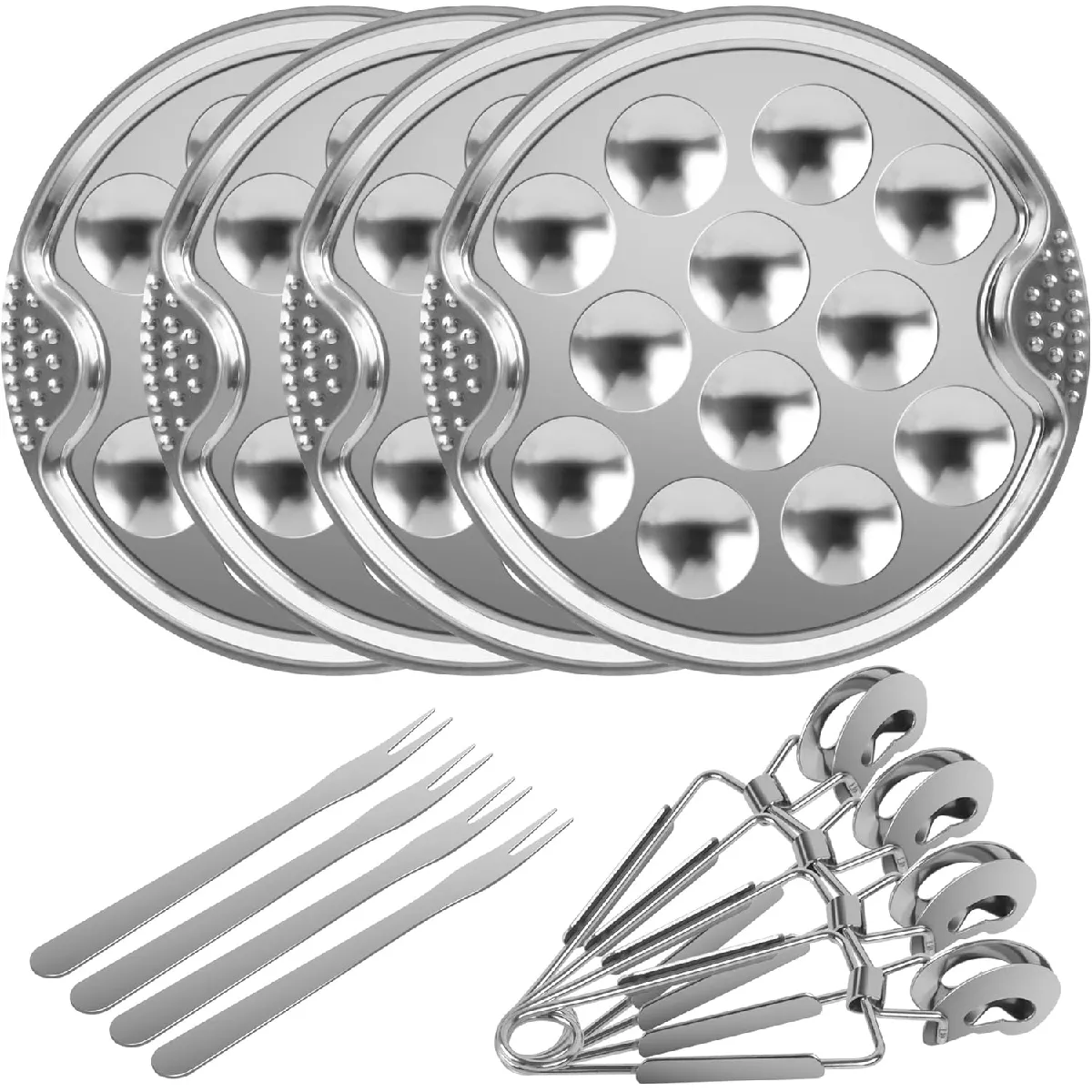 Ce service à escargots complet de 12 pièces est un indispensable pour vos repas festifs et vos dîners à la française. Il comprend 4 assiettes à escargots à 12 cavités, 4 pinces et 4 fourchettes spéciales, parfaits pour savourer vos escargots en toute élégance. Fabriquées en acier inoxydable de haute qualité, les assiettes sont robustes, durables et résistantes à la déformation, contrairement à l’aluminium. Les pinces ergonomiques assurent une prise en main sûre et confortable, tandis que les fourchettes permettent d’extraire facilement la chair des coquilles. Ce service est idéal non seulement pour les escargots, mais aussi pour les fruits de mer, moules, huîtres ou champignons farcis. Facile à entretenir, les assiettes et fourchettes passent