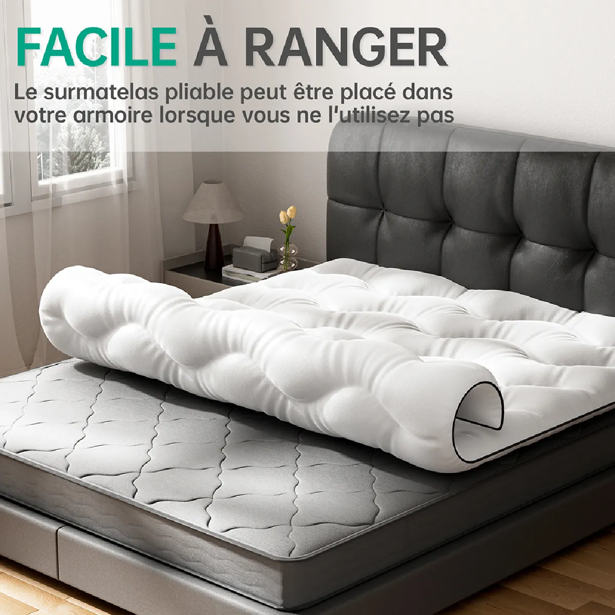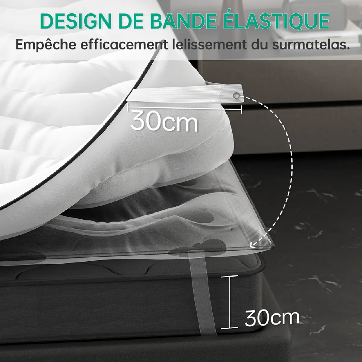Nos surmatelas sont équipées de sangles élastiques et peuvent s'adapter aux matelas d'une épaisseur de 10 à 30 cm. Qu'il s'agisse d'un lit, d'un canapé, d'un canapé-lit ou même d'une matelas gonflable, sa texture douce vous enveloppe dans une coquille de confort pour des nuits paisibles.