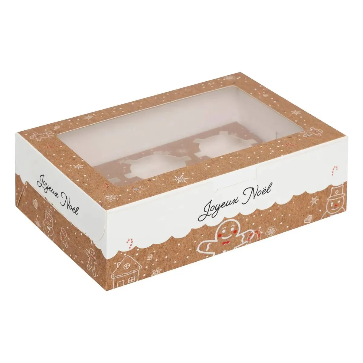 Commentaire vendeur : Informations Techniques : Dimensions : L. 24 x l. 15,5 x H. 7,5 cm Matière : Carton Spécificités : Festive & Utile Lot de 6 boîtes à gâteaux de Noël Avec 6 supports pour cupcakes Imprimé motifs de Noël Poids : 0,35 kg Couleur : Beige