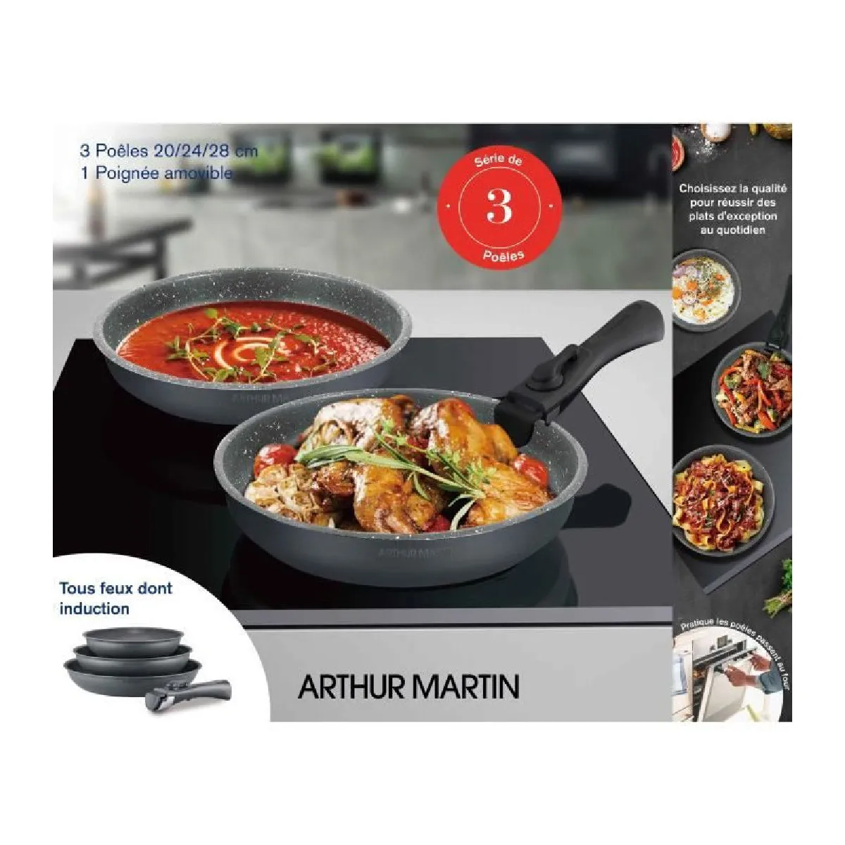 Batterie de cuisine ARTHUR MARTIN AM521GM Set de 3 poeles - Gris Mat 20-24-28 cm + 1 poignée amovible - Tous feux dont inductio