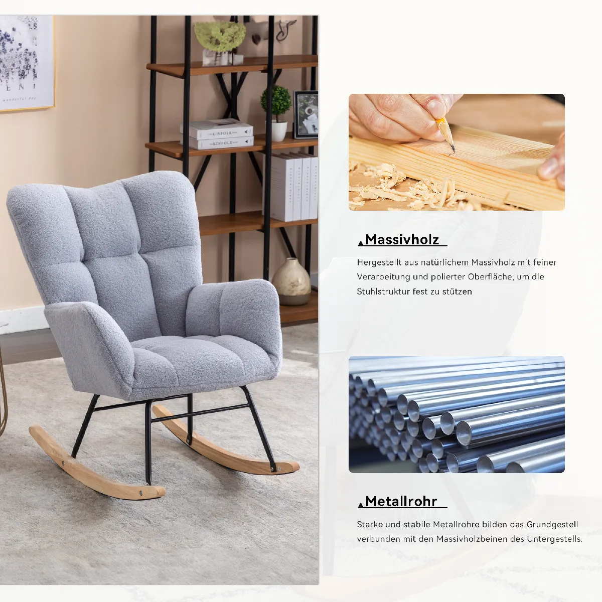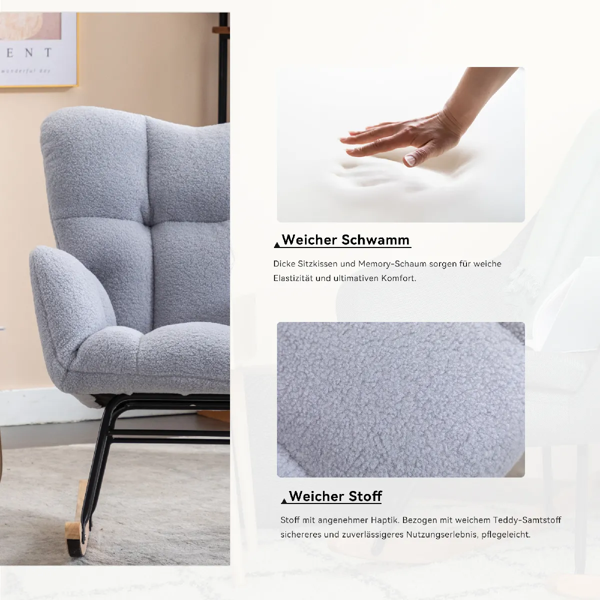 Descriptions FR: 1. Confort ultime : Ce fauteuil à bascule est fabriqué avec un tissu doux et agréable pour la peau, un design capitonné et un dossier en mousse épaisse, pour vous offrir une assise exceptionnellement confortable. Que vous vous détendiez dans le salon ou que vous vous reposiez dans la chambre, ce fauteuil vous accompagne avec chaleur pour profiter de vos moments privés. 2. Robuste et durable : Ce fauteuil est équipé d'une base en bois massif associée à un cadre en métal noir revêtu de poudre, assurant une excellente durabilité et stabilité pour une utilisation à long terme. Les coutures doubles renforcent la structure pour une durabilité accrue. 3. Design moderne et minimaliste : Le corps classique du fauteuil s'harmonise avec les bascules en bois naturel, offrant un style simple et moderne qui s’adapte à divers décors et rehausse votre espace de vie. 4. Design ergonomique avec protection silencieuse : Grâce à son dossier haut ergonomique et ses accoudoirs épaissis, ce fauteuil offre un bon soutien pour votre dos et vos bras, réduisant la fatigue pour un confort prolongé. La base à bascule est équipée de longues bandes de feutre pour assurer des mouvements silencieux et éviter les rayures au sol, protégeant ainsi votre environnement domestique. 5. Polyvalent et facile à assembler : Parfait pour le salon, la chambre ou le bureau, ce fauteuil à bascule est idéal pour la détente, la lecture ou la sieste. Il supporte jusqu'à 250 lbs (113 kg), dispose d'une structure solide et peut être facilement assemblé en 15 minutes. DE: Produktposition Weiches Teddy-Material + Schaumstofffüllung + Holzrahmen + Schwarz Lackierter Metallrahmen + Holz-Schaukelbeine + Gepolstert + Boden-Schutz- und Isolationsschicht Technische Daten 80*70*95cm(L*W*H) Verpackungsabmessungen 72*69*38cm(L*W*H) N.W./G.W. 12kg/16kg Gewichtskapazität 110kg Produktmontage Es kann von einer Person in 15 Minuten zusammengebaut werden Anwendbares Alter Von 7 Bis 70 Jahren Produktpflege Flecken mit einem weichen, trockenen Tuch abwischen
