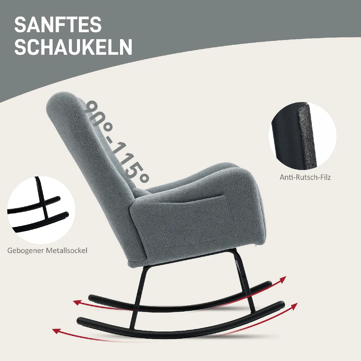 Caractéristiques du produit : Doux mouvement de bercement : Laissez le stress derrière vous et profitez du doux mouvement de bercement de ce fauteuil à bascule. Idéal pour lire, regarder la télévision ou simplement se détendre, pour un confort optimal. Design confortable : Enveloppez-vous de douceur grâce au dossier rembourré et incurvé et à la mousse haute densité. Le tissu doux et moelleux du fauteuil à bascule offre une expérience d'assise incomparable : il suffit de se détendre. Soutien renforcé : Grâce aux bandes de feutre antidérapantes, vous profiterez d'un bercement silencieux et sécurisé. La structure robuste en métal thermolaqué du fauteuil garantit un confort durable et une élégance raffinée. Rangement pratique : Gardez votre maison bien rangée ! La poche latérale du fauteuil à bascule offre un espace de rangement pour vos livres ou la télécommande, pour que tout soit à portée de main pendant que vous vous bercez, pour une lecture relaxante. Dimensions du fauteuil à bascule : 67 cm (L) x 95 cm (P) x 100 cm (H). Dimensions de l'assise : 41 cm (L) x 49 cm (P) x 42-49 cm (H). Poids maximal supporté : 120 kg. Assemblage requis.