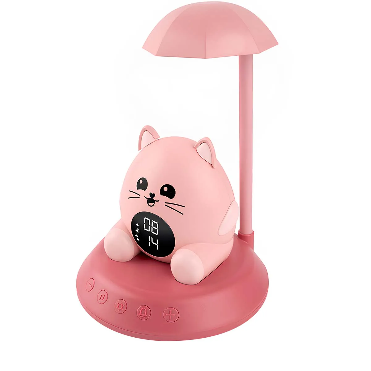 Ce réveil éducatif en forme de chat associe veilleuse, affichage digital et mélodies pour accompagner les nuits des enfants. La lampe parapluie émet une lumière douce ajustable sur trois niveaux pour apaiser au coucher. Six mélodies favorisent le réveil ou l'endormissement, tandis que des icônes soleil et lune indiquent les moments de repos. Trois minuteries de 15, 30 ou 60 minutes règlent la durée d'éclairage.