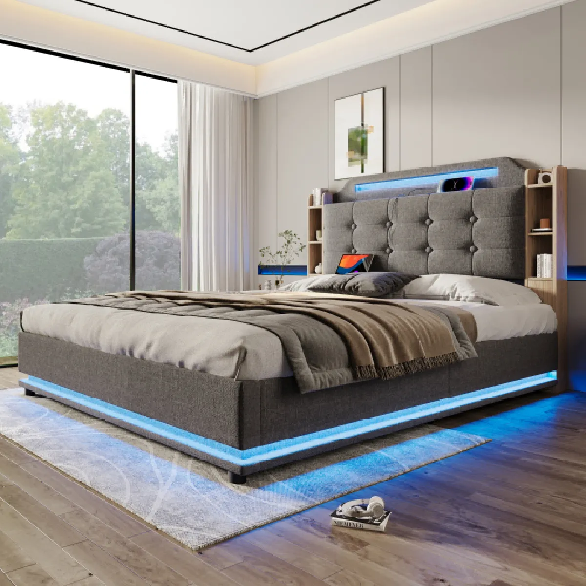 Envie de transformer votre chambre en un espace haut de gamme en un clin d'il ? Ce lit est fait pour vous ! Son tissu en lin est respirant et doux pour la peau, tandis que ses panneaux en MDF écologique lui confèrent une allure à la fois rustique et sophistiquée. Le sommier à hauteur réglable par vérin hydraulique et le panneau latéral à multiples compartiments offrent un accès facile à un espace de rangement généreux. Les bandes LED à double anneau situées en tête et au pied du lit alternent entre lumière chaude et froide, créant une ambiance chaleureuse idéale pour lire le soir ou se réveiller en douceur. La tête de lit est équipée de deux ports USB et Type-C à charge rapide, vous permettant de recharger plusieurs appareils simultanément à pleine vitesse. Enfin, le cadre de lit arbore un design carré en trois dimensions, un parfait mélange de style rétro et d'esthétique moderne, apportant une touche artistique à votre chambre. N'attendez plus, offrez-vous le vôtre