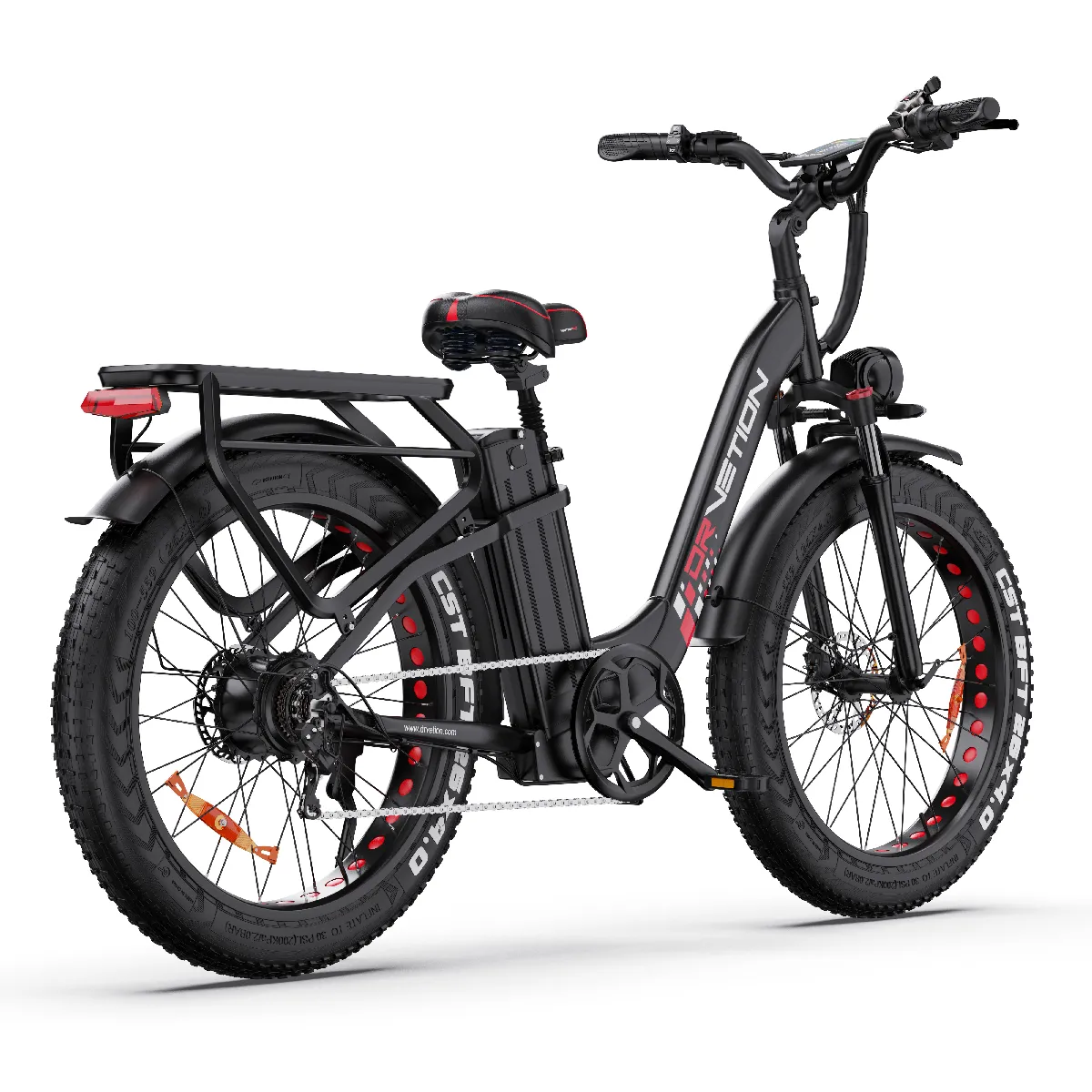 Équipé de pneus larges CST 26"×4", il assure une stabilité et une adhérence optimales sur le sable, la boue, la neige ou les surfaces accidentées. Conçus pour une confiance absolue, ces pneus vous permettent de rouler toute l'année, dans n'importe quelle condition, sans compromis sur la performance ni la sécurité.